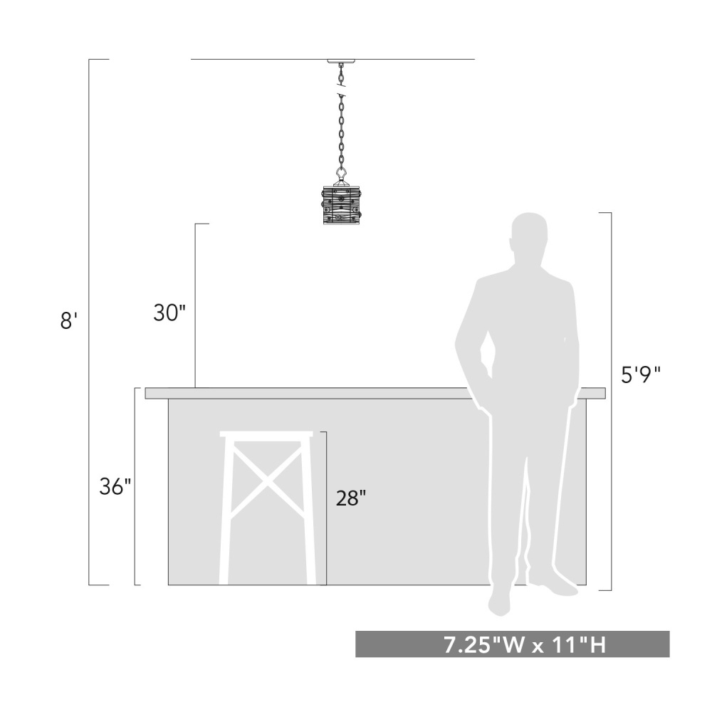 Bring Glam elegance into your home with the Golden Lighting Joia 1-light Pendant. Featuring a fabric shade and a Peruvian Silver frame, it creates a welcoming atmosphere. The Sterling Mist shade, characterized by a fine weave and metallic appearance, diffuses light with a soft glow, enhancing the chic ambiance of your space. The Peruvian Silver finish showcases a rustic texture and warm undertones, providing a timeless quality. Ideal for indoor spaces not subject to moisture, this pendant is sloped-ceiling compatible and adjustable in height (min: 12.5"- max: 84.5"). Overall dimensions are 7.25"W x 11"H x 7.25"D, requiring 1 E26 Medium base bulb (not included, max 60 wattage). Elevate your decor with the quality and sophistication of this exquisite lighting piece.