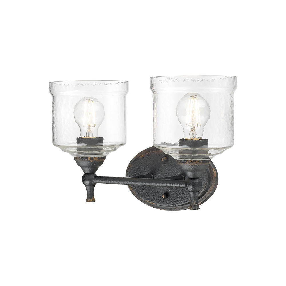 Elevate your space with a touch of rustic elegance, thanks to the Golden Lighting Keating 2-light Vanity. Featuring a glass shade and an antique black iron frame, it's perfect for creating a welcoming atmosphere in bathrooms. The glass shade showcases hammered water glass, lending itself to an enchanting light effect that beautifully refracts illumination in your home. Capturing the raw, authentic charm of a bygone era, the antique black iron finish tells a story of time, revealing glimpses of a warm, antiqued gold base beneath its textured surface. Designed for damp locations, this vanity light is suitable for bathrooms and other semi-enclosed spaces with occasional moisture. It requires 2 E26 Medium base bulbs (not included), with a maximum wattage of 100 per bulb. Overall Dimensions: 15"W x 9.75"H x 7.5"D, making it an ideal choice for any bathroom seeking style and practicality. Infuse your space with the artistry and craftsmanship you deserve.