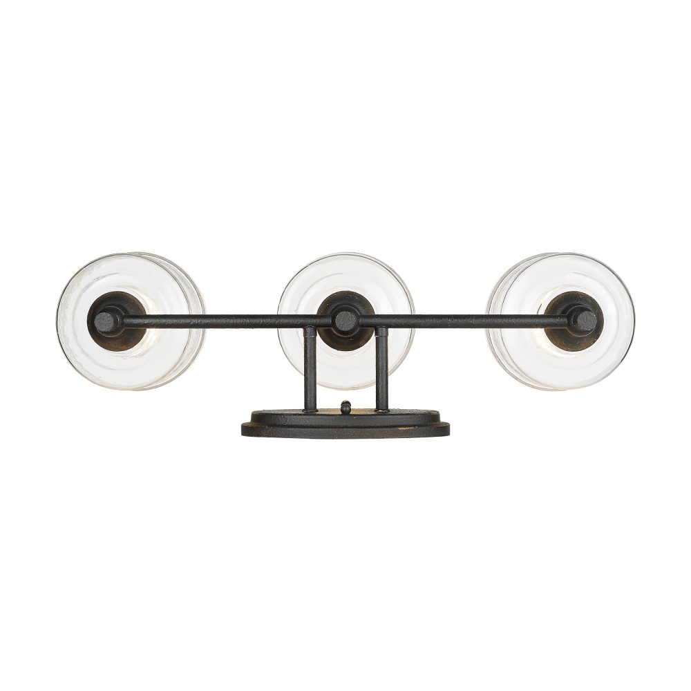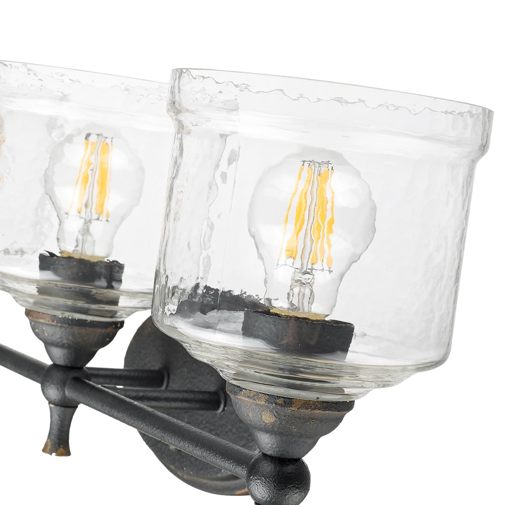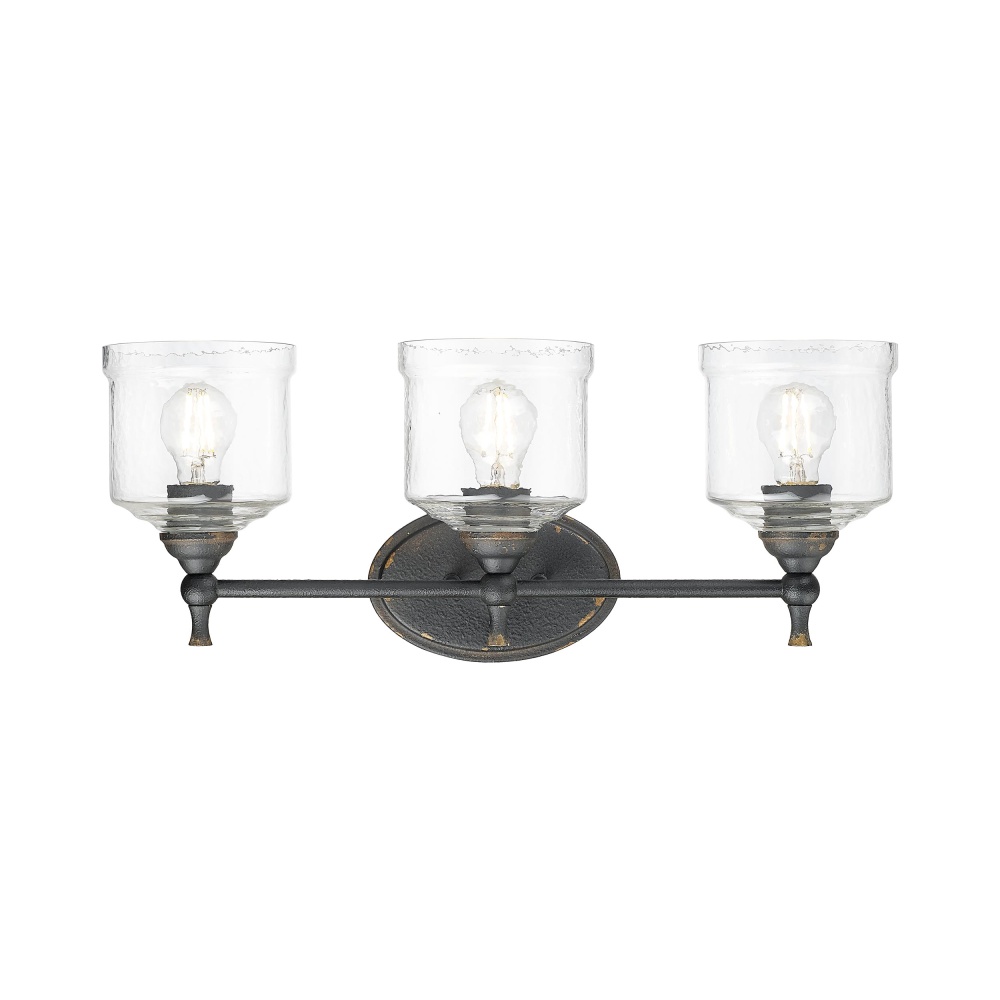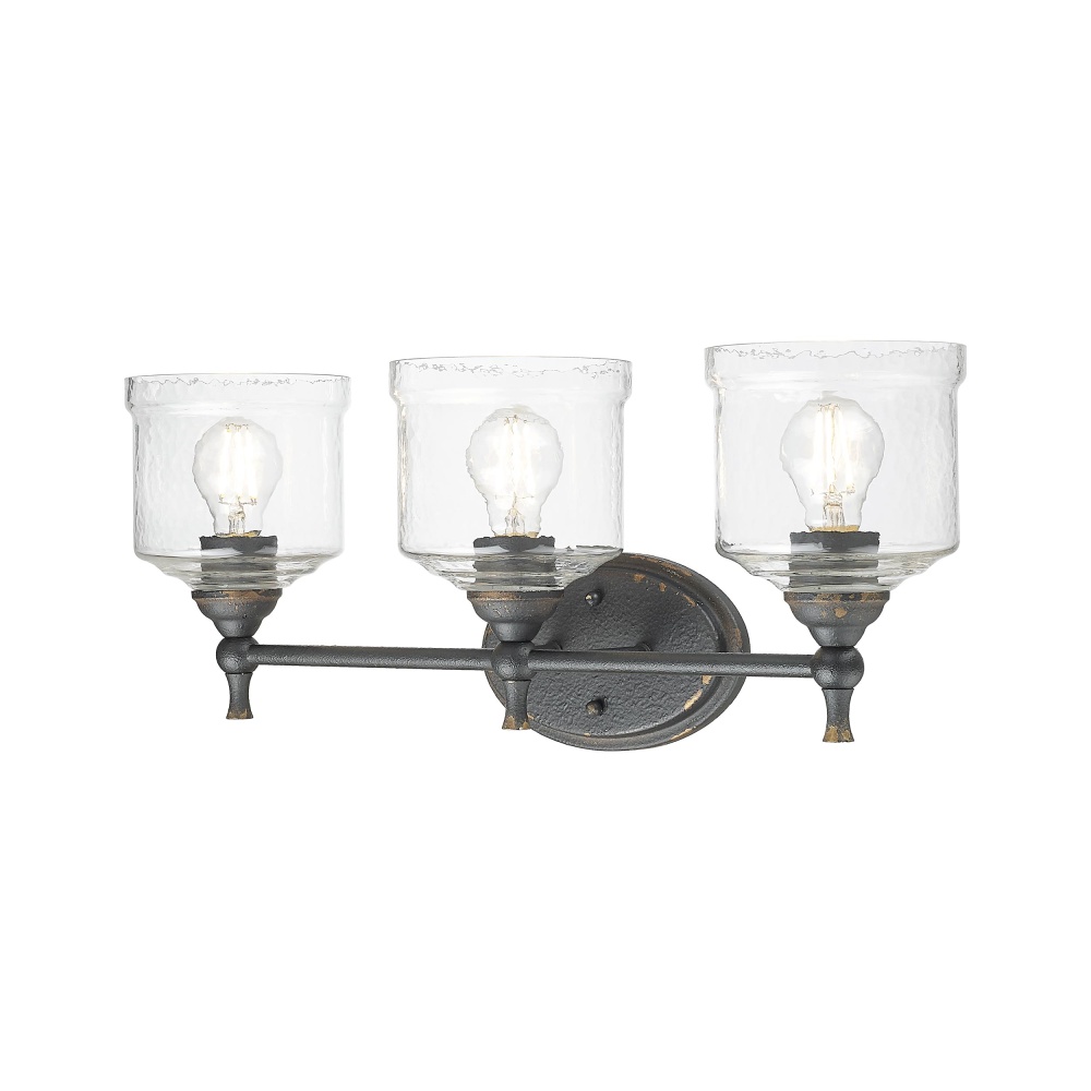 Bring farmhouse elegance into your home with the Golden Lighting Keating 3-light Vanity in Antique Black Iron. Featuring a glass shade and a rustic Antique Black Iron frame, it creates a welcoming atmosphere. This glass shade offers a Hammered Water Glass finish, distinguished by a heavy, irregular texture that beautifully distorts and refracts light, adding an artisanal touch to your space. The Antique Black Iron finish captures the raw charm of time with a textured matte black surface revealing glimpses of a warm gold base, perfect for adding handcrafted character. Brighten up bathrooms with dedicated lighting that flatters while providing practical task illumination. The fixture is damp location rated, suitable for covered spaces with occasional moisture like bathrooms and laundry rooms. Overall Dimensions: 23.88"W x 9.75"H x 7.5"D. Requires 3 E26 Medium base bulbs (not included), maximum 100 wattage per bulb. Perfect for creating a cozy, inviting ambiance, this fixture complements any rustic or traditional decor while showcasing quality craftsmanship.