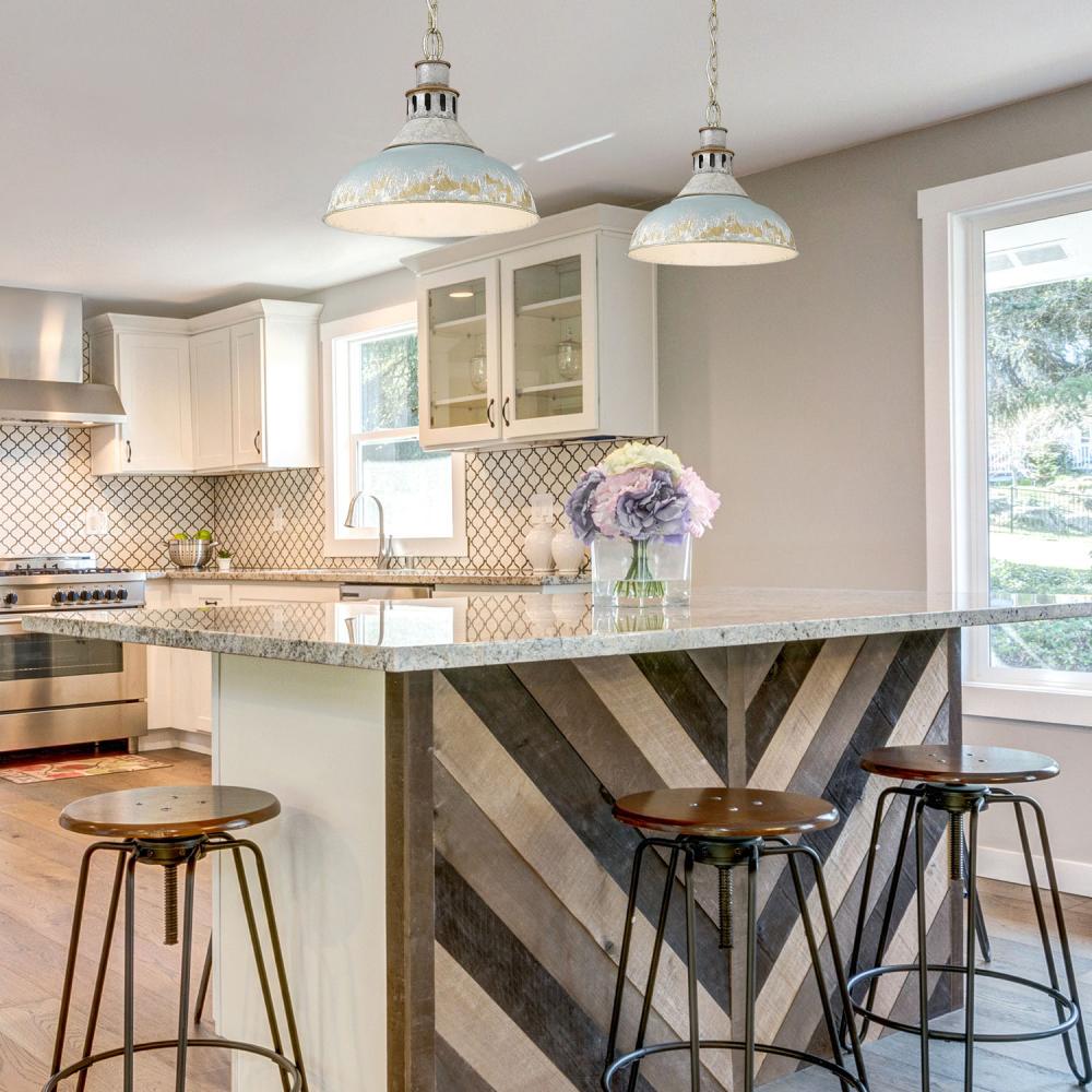Bring farmhouse elegance into your home with the Golden Lighting Kinsley 1-light Pendant. Featuring a Metal shade and an Aged Galvanized Steel frame, it creates a welcoming atmosphere. The Antique Teal shade offers a heavily distressed, matte teal finish that reveals hints of antique gold and white beneath, enhancing its vintage allure. Crafted in a finish that mirrors a timeless found object, the Aged Galvanized Steel frame adds a sophisticated industrial touch. Versatile for kitchens, dining rooms, or entryways, this fixture is Damp Location Rated, making it suitable for covered and semi-enclosed spaces. It’s also sloped-ceiling compatible and adjustable in height from 16.75" to 88.75". Overall dimensions are 14"W x 13.38"H x 14"D, requiring one E26 medium-base bulb (not included) with a maximum wattage of 100. Elevate your decor with this beautiful, timeless light fixture that showcases the character of artisanal craftsmanship.