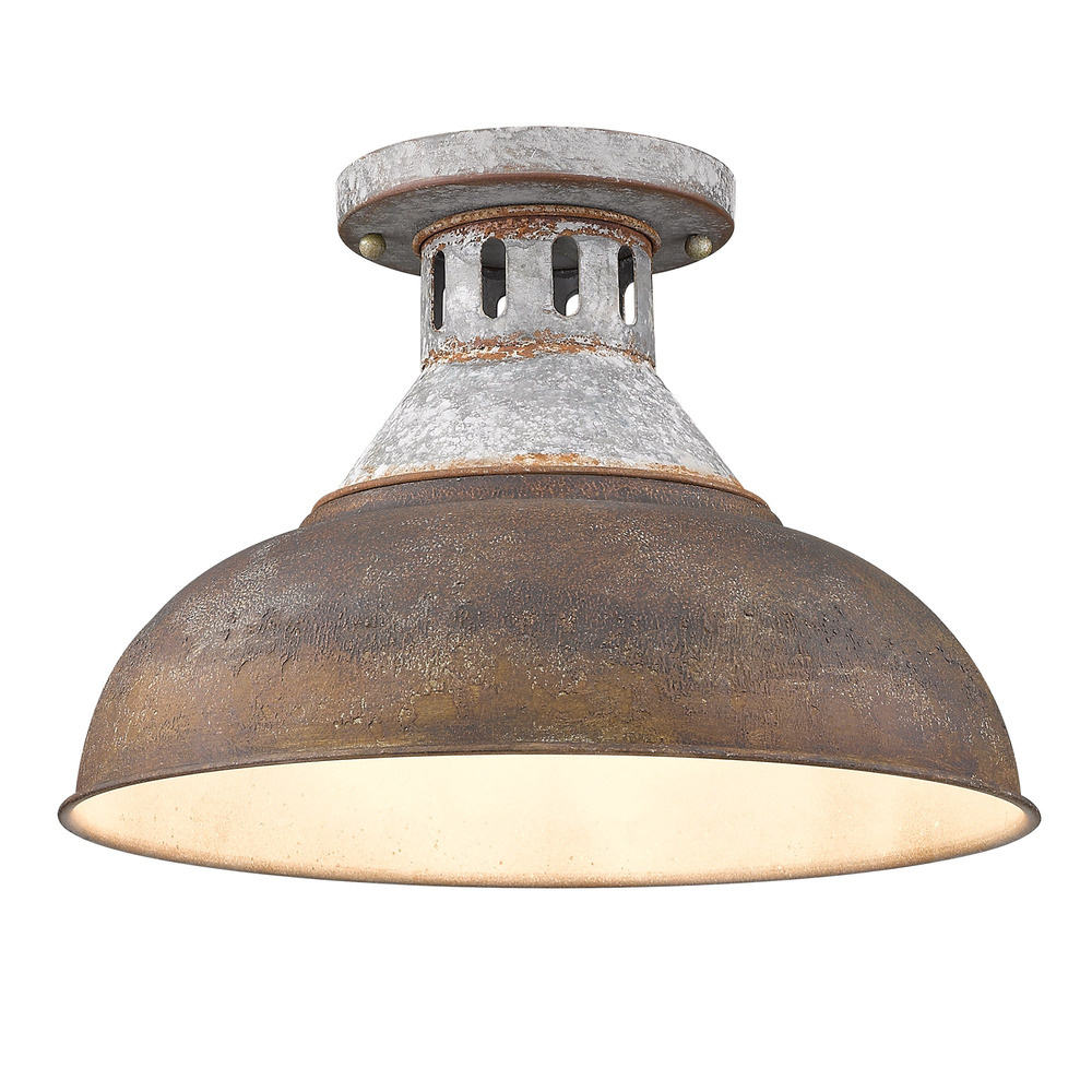 Bring traditional elegance into your home with the Golden Lighting Kinsley 1-light Semi-Flush Mount. Featuring an Antique Rust metal shade and an Aged Galvanized Steel frame, it creates a welcoming atmosphere. The metal shade features a richly distressed, multi-layered finish, displaying a rustic reddish-brown top coat that reveals an antique gold leaf base underneath. This chipped texture adds depth and character, creating a cozy glow. The Aged Galvanized Steel finish reveals a powerful story of weathered beauty and craftsmanship, perfectly suitable for any rustic or industrial-themed setting. Ideal for entryways, bedrooms, kitchens, and living areas with mid-height ceilings, this fixture is damp location rated for covered and semi-enclosed spaces. Requires standard installation and accommodates 1 E26 medium base bulb (not included), maximum 100 watts. Overall dimensions: 14"W x 9.63"H x 14"D. Infuse your home with a vintage-inspired touch that resonates with warmth and artistic charm.