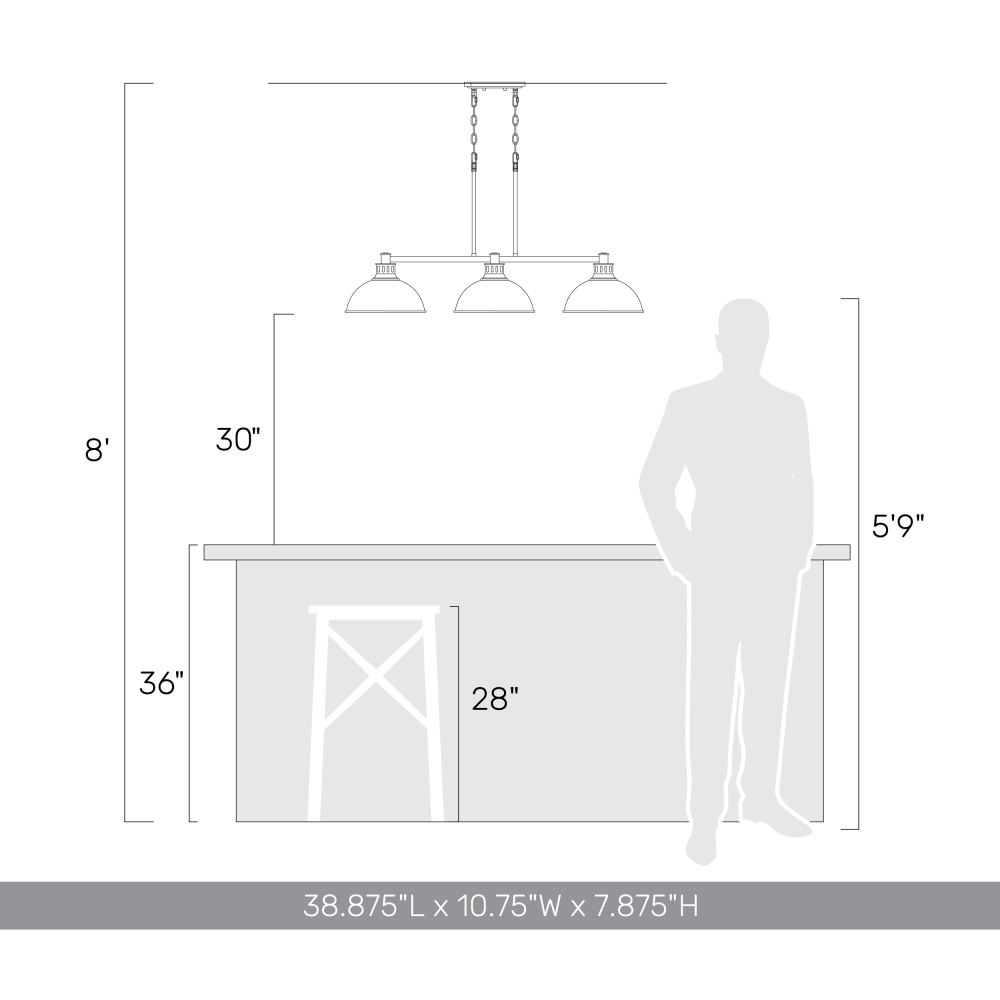 Make a statement with the rustic elegance of the Golden Lighting Kinsley 3-light Island Light. Featuring a metal shade and an Aged Galvanized Steel frame, it creates a welcoming atmosphere in your home. The Antique Teal shade showcases a heavily distressed finish with a rough texture, revealing layers of gold leaf and off-white beneath. This dramatic color and texture beautifully reflect light, adding character to any space. The Aged Galvanized Steel finish mimics the time-worn allure of industrial chic, providing both beauty and durability. Designed for kitchen islands, this fixture is Dry Location Rated, making it ideal for indoor spaces not subject to moisture. With an Adjustable Height feature ranging from 10.75" to 55.625", it adapts perfectly to your ceiling. Dimensions are 38.88"W x 7.88"H x 10.75"D, and it requires 3 E26 Medium base bulbs (not included), with a maximum wattage of 100 per bulb. Effortlessly blend functionality with artistry in your home with this exquisite fixture.