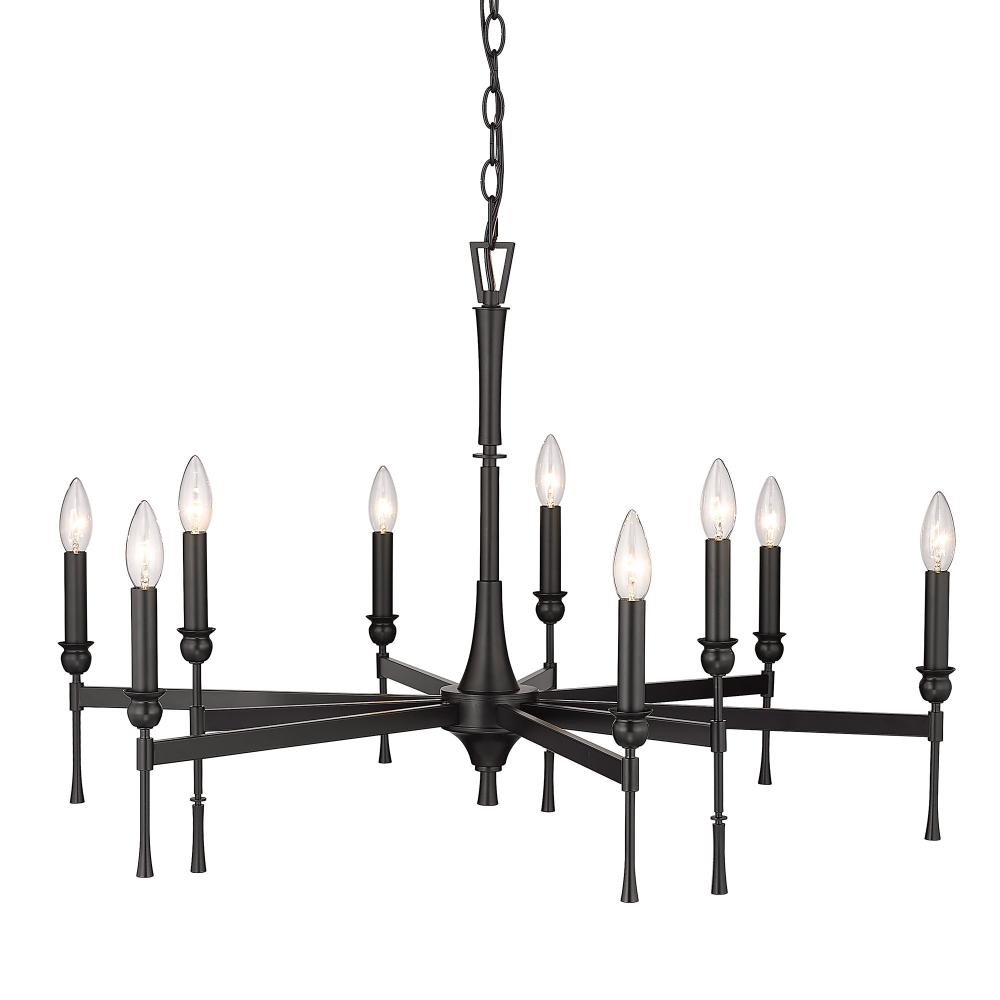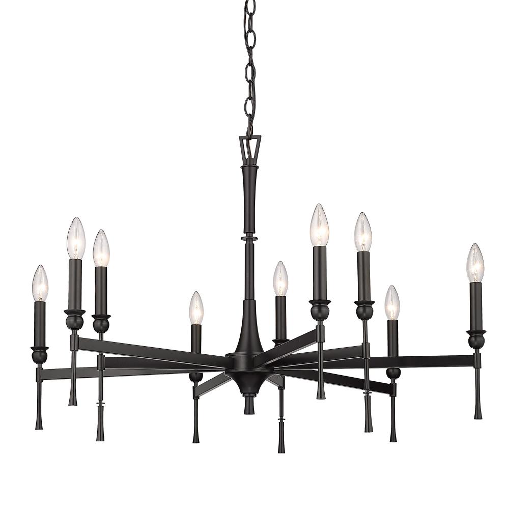 Bring modern sophistication into your home with the Golden Lighting Landon 9-light Chandelier in Matte Black. It features a sleek frame without a shade, creating a captivating illumination that enhances your decor. The matte black finish is smooth to the touch and reflects a clean, understated elegance, perfectly blending with various design styles. Make a grand impression in dining rooms and foyers or elevate bedrooms and living spaces with a touch of classic elegance. This chandelier is dry location rated, ideal for indoor spaces not subject to moisture. It is sloped-ceiling compatible and adjustable in height, with dimensions of 34"W x 22.63"H x 34"D, and requires 9 E12 candelabra base bulbs (not included) with a maximum wattage of 60 per bulb. Elevate your lighting experience with this exquisite piece that combines stylish design and quality craftsmanship.