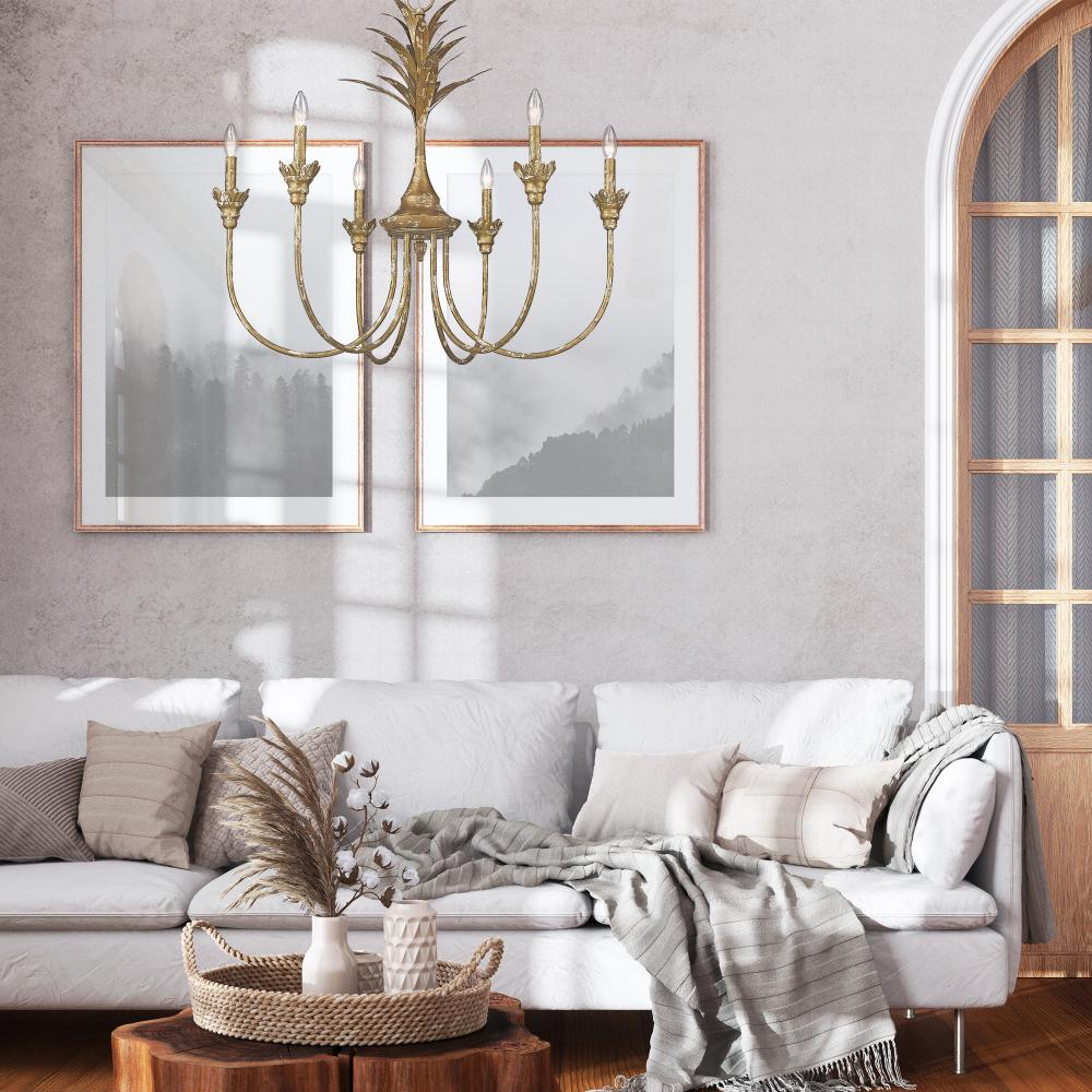 Bring nature-inspired elegance into your home with the Golden Lighting Lillianne 6-light Chandelier in heirloom gold. This exquisite chandelier creates a welcoming atmosphere. Featuring an elegant design with no shade, it allows light to permeate beautifully, illuminating its organic floral motifs. Each chandelier is hand-painted, showcasing unique variations that celebrate artisanal craftsmanship. The heirloom gold finish provides a rich, rustic aesthetic that adds sophistication and history to your decor. This fixture is suitable for dry locations, making it perfect for indoor spaces such as dining rooms and entryways. It offers a sloped-ceiling compatibility and can be adjusted in height from 34.75" to 104.25". It requires 6 E12 candelabra base bulbs (not included), with a maximum of 60 watts per bulb. Overall Dimensions: 33.75"W x 31.25"H x 33.75"D. Elevate any room's ambiance with this stunning chandelier that embodies quality and style.
