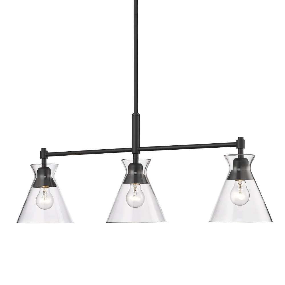 Bring modern elegance into your home with the Golden Lighting Malta 3-light Island Light in Matte Black. Featuring a glass shade and a matte black frame, it creates a welcoming atmosphere. The clear glass shade offers brilliant, unobstructed light, allowing the beauty of the bulb and fixture's design to shine. Its timeless appeal complements various styles, from minimalist to contemporary. The matte black finish is smooth to the touch, enhancing clean lines and adding sophistication to your décor. Tailored for kitchen islands, this fixture is Dry Location Rated, ideal for indoor spaces like bedrooms and living rooms. It is also sloped-ceiling compatible and has an adjustable height feature, making installation versatile and easy. Overall dimensions are 34"W x 13"H x 7.13"D, and it requires 3 E26 Medium base bulbs (not included), with a maximum wattage of 60 per bulb. Elevate your space with this stylish and quality light fixture, perfect for modern living.