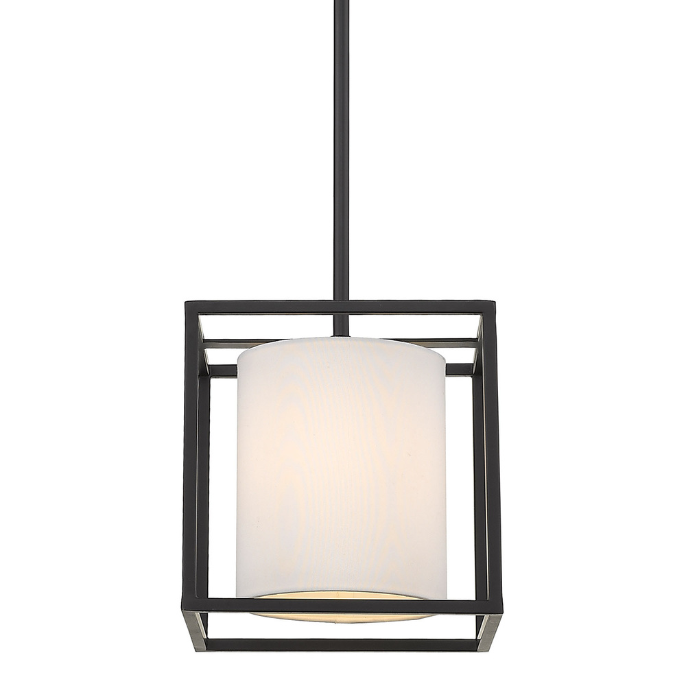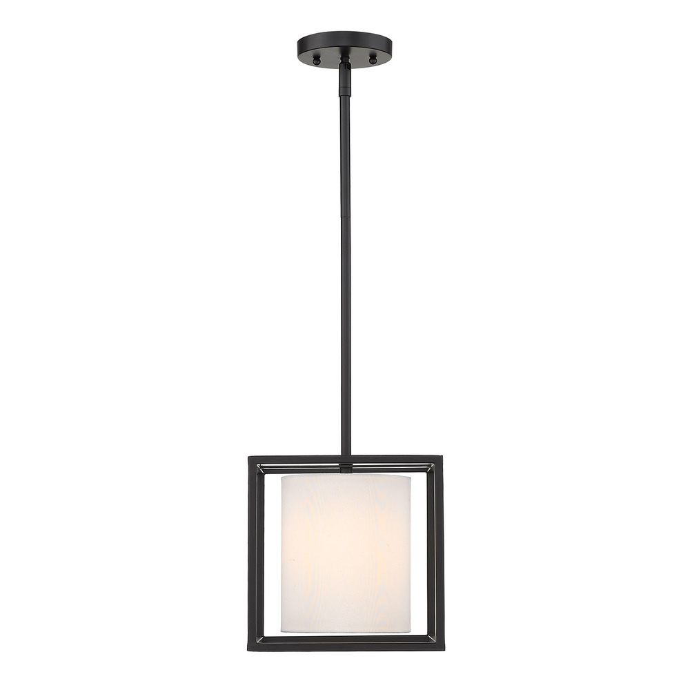 Bring modern elegance into your home with the Golden Lighting Manhattan 1-light Pendant in Matte Black. Featuring a fabric shade and a sleek matte black frame, it creates a welcoming atmosphere. The Modern White fabric shade offers a crisp, clean look that is bright and fresh, crafted from high-quality fabric with a fine, linear weave. Its matte finish ensures a soft, diffused glow, adding a touch of effortless style to any room. The matte black finish is timeless and versatile, providing an understated elegance that complements virtually any decor. This pendant light is perfect for kitchens, dining rooms, and even entryways, and is rated for damp locations, making it suitable for covered and semi-enclosed spaces like bathrooms and laundry rooms. The convertible design features an adjustable height, allowing for installation as a semi-flush mount or pendant, with hanging heights ranging from 11.625" to 53.625". Overall dimensions are 9"W x 9"H x 9"D, and it requires 1 E26 Medium base bulb (not included) with a maximum wattage of 60. Add a stylish statement with the Golden Lighting Manhattan Pendant, ideal for creating atmosphere and quality in your living space.