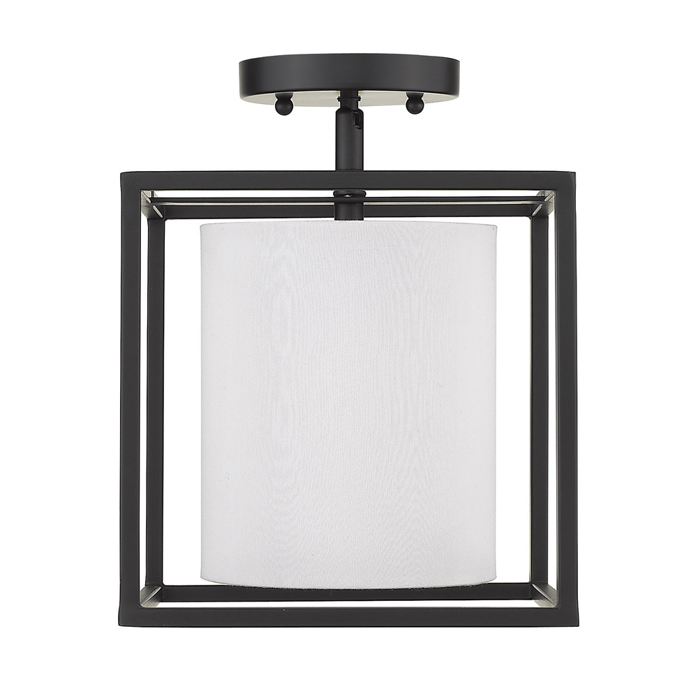 Bring modern elegance into your home with the Golden Lighting Manhattan 1-light Semi-Flush Mount. With its fabric shade and Matte Black finish, it's a statement piece that creates a welcoming ambiance. This fixture features a crisp Modern White fabric shade, designed for a soft and glare-free glow, complemented by a smooth matte black surface that absorbs light effectively. This sleek combination adds a sophisticated touch to any decor. Ideal for damp locations, it fits perfectly in covered areas like bathrooms and laundry rooms. The fixture is also sloped-ceiling compatible and comes with an adjustable height feature to tailor the lighting to your needs. Overall Dimensions: 9"W x 9"H x 9"D. Requires 1 E26 Medium base bulb (not included), with a maximum wattage of 60 watts. Style your home with this elegant semi-flush mount, designed for both functionality and aesthetic appeal.