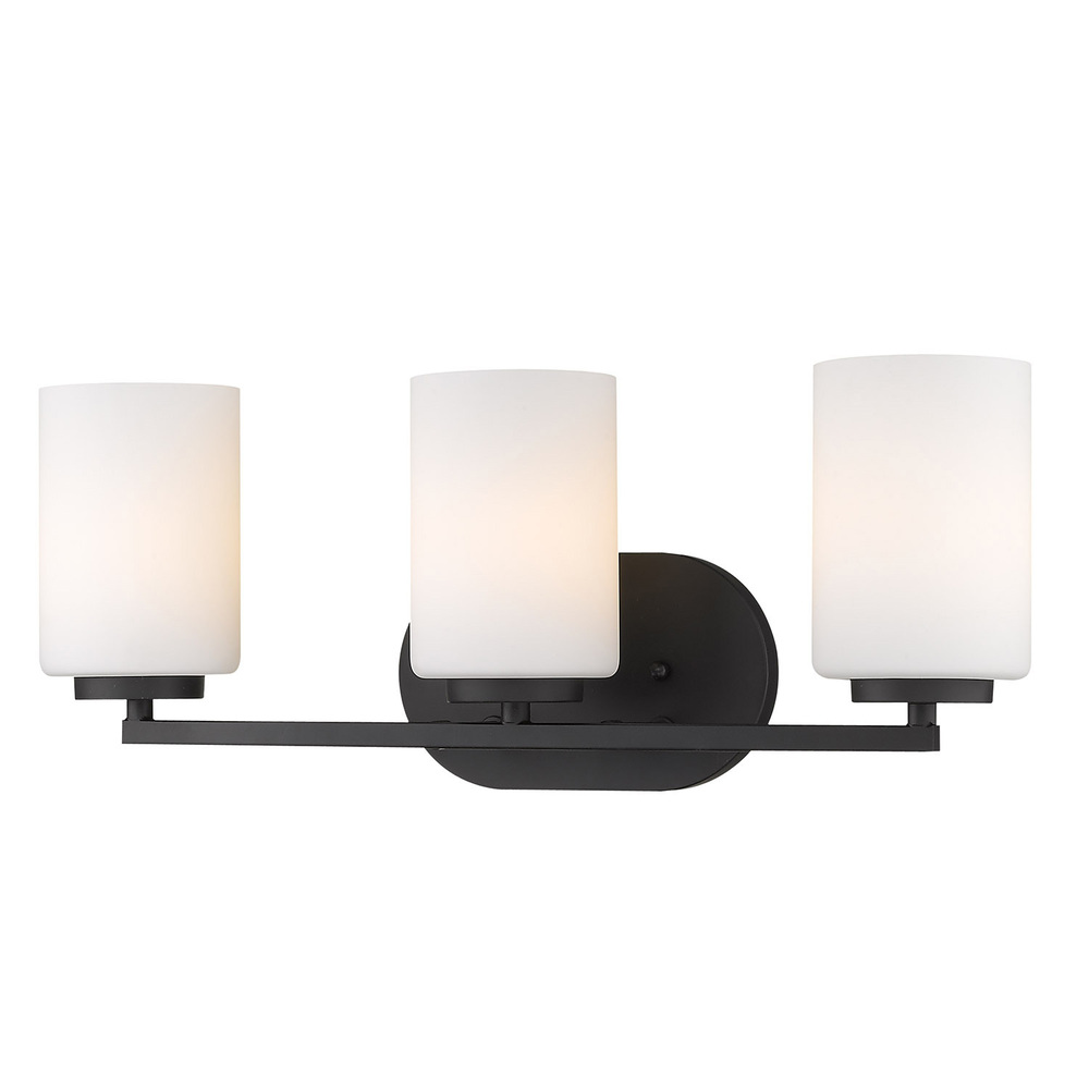 Bring transitional elegance into your home with the Golden Lighting Manhattan 3-light Vanity in Matte Black. Featuring an opal glass shade and a matte black frame, it creates a welcoming atmosphere. The opal glass shade provides a milky, translucent white color that diffuses light evenly for a soft, glare-free glow. This timeless and elegant design offers a luminous ambiance, perfect for modern and contemporary spaces. The matte black finish is smooth to the touch, providing a non-reflective surface that absorbs light and enhances the graphic quality, making it a versatile choice for various decors. Ideal for bathrooms, this fixture is damp location rated, suitable for covered and semi-enclosed spaces with occasional moisture, like covered porches or laundry rooms. Requires 3 E26 Medium base bulbs (not included), max 60 wattage per bulb. Overall dimensions are 20"W x 8"H x 5.88"D, and its beautiful design will add quality and charm to your space, making it the perfect addition to any home.