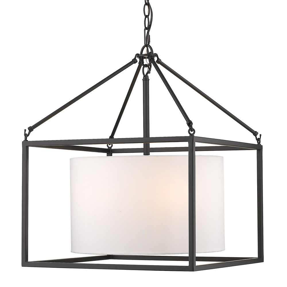 Bring modern elegance into your home with the Golden Lighting Manhattan 5-light Chandelier in Matte Black. Featuring a fabric shade and a matte black frame, it creates a welcoming atmosphere. The Modern White fabric shade offers a crisp, clean look, crafted from high-quality material that diffuses light softly, providing a glare-free glow. This results in a sophisticated and ambient lighting effect, perfect for any setting. The matte black finish is both timeless and versatile, complementing various decor styles from minimalist to contemporary. Its deep, uniform color absorbs light while presenting a smooth and sleek surface that adds an understated elegance. Make a grand impression in dining rooms and foyers or elevate bedrooms and living spaces with a classic touch. Dry Location Rated, it’s ideal for indoor spaces not subject to moisture. The chandelier is sloped-ceiling compatible and adjustable in height, ranging from 23.25" to 95.25". Overall Dimensions: 18.38"W x 22.5"H x 18.38"D, requiring 5 E12 Candelabra base bulbs (not included) with a maximum wattage of 60 per bulb. Experience the blend of style and functionality that will transform the heart of your home into a chic sanctuary.