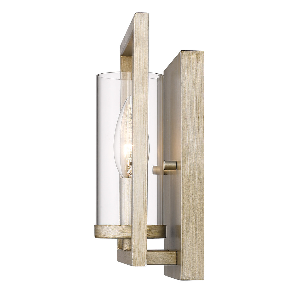 Bring modern elegance into your home with the Golden Lighting Marco 1-light Wall Sconce in White Gold. Featuring a glass shade and a white gold frame, it creates a welcoming atmosphere. The clear glass shade offers brilliant, unobstructed light, polished to a high-gloss shine that allows the beauty of the bulb and fixture design to take center stage. Our White Gold finish, a sophisticated blend of warm gold and cool silver with a rustic, brushed texture, adds character to any space. This damp location-rated sconce is ideal for covered and semi-enclosed spaces such as bathrooms and porches. With overall dimensions of 7"W x 8.5"H x 3.38"D and requiring 1 E12 candelabra base bulb (not included, max wattage 60), this fixture enhances hallways, stairways, and cozy ambiances in living areas — perfect for achieving a decorative statement with quality craftsmanship.