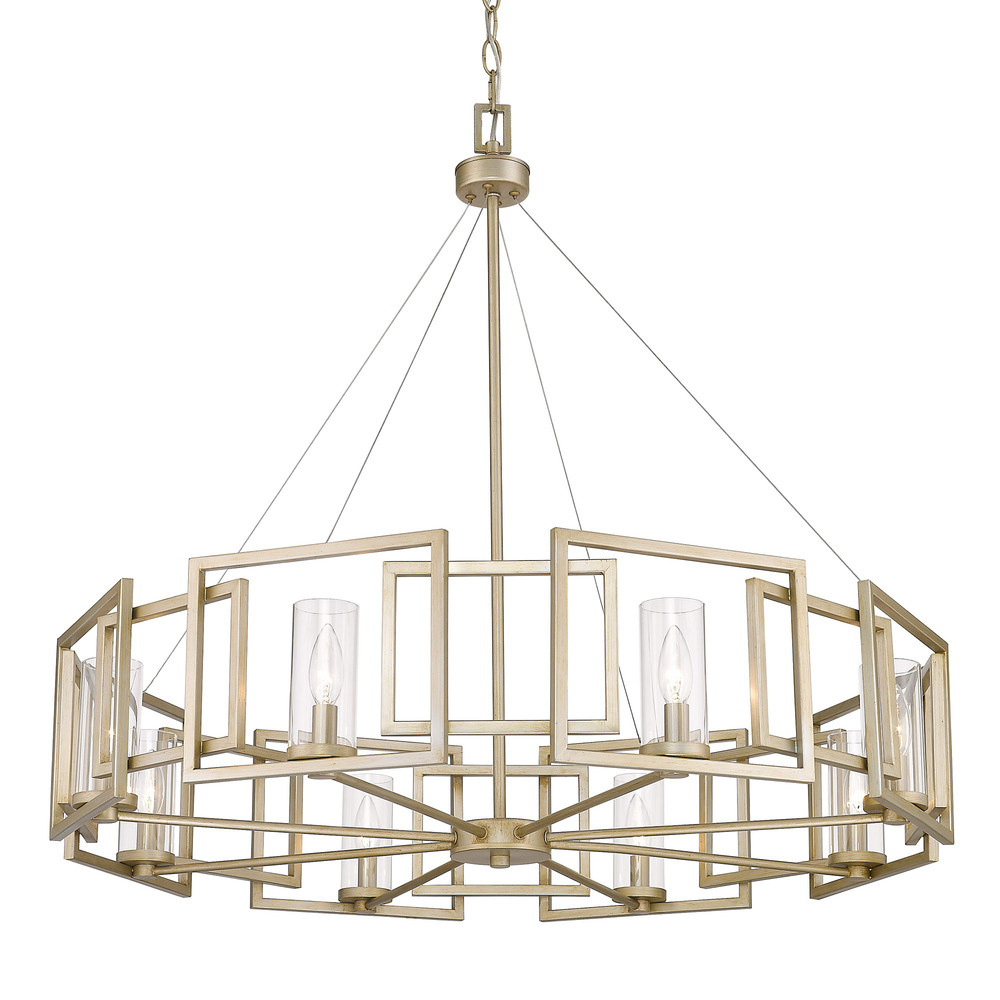 Bring artisanal glamour into your home with the Golden Lighting Marco 8-light Chandelier in White Gold. Featuring a glass shade and a beautiful white gold frame, it creates a welcoming atmosphere perfect for entertaining. The clear glass shade provides unobstructed brilliance, allowing the soft glow of the bulbs to shine through. Polished and timeless, this shade works seamlessly with various styles, from contemporary to traditional. The white gold finish presents a sophisticated blend of warmth and elegance, making it an ideal choice for those seeking a unique metallic accent in their decor. Its low-lustre glow adds character to any room it graces. Perfect for dining rooms, foyers, or any elegant space, this piece is dry location rated for indoor use, ensuring it thrives where moisture isn’t a concern. Installation is hassle-free with adjustable height features, allowing customization suited to your needs. Overall dimensions are 35.38"W x 32.75"H x 35.38"D, and it requires 8 E12 Candelabra base bulbs (not included) with a maximum of 60 watts per bulb. Transform your interiors with this outstanding combination of style and quality.