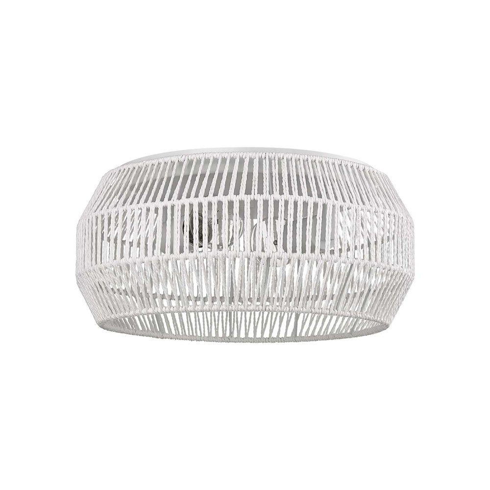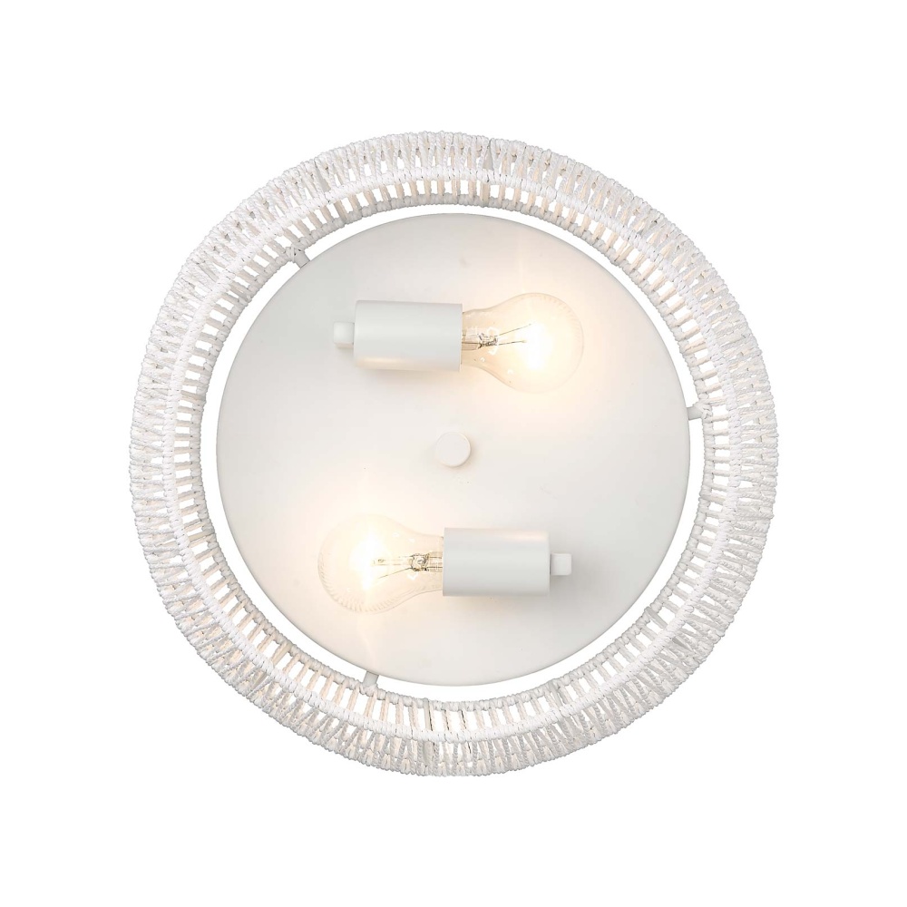 Bring Boho elegance into your home with the Golden Lighting Marlee 2-light Flush Mount. Featuring a Rope shade and a Matte White frame, it creates a welcoming atmosphere. The Bleached White Raphia Rope shade adds a highly textural and organic appearance, bringing a breezy coastal vibe to your space. The clean, bright shade complements the fixture's modern look, beautifully diffusing light. The Matte White finish is epitome of modern minimalism, enhancing the clean lines of the design. Its velvety surface absorbs light, creating an understated and sophisticated feel. Ideal for low ceilings in hallways, closets, laundry areas, bathrooms, and more, this fixture is damp location rated, perfect for covered spaces with occasional moisture. Overall Dimensions: 14.13"W x 6.5"H x 14.13"D. Requires 2 E26 Medium base bulbs (not included), max 60 wattage per bulb. Embrace natural beauty and artisanal quality in your home with this remarkable fixture.