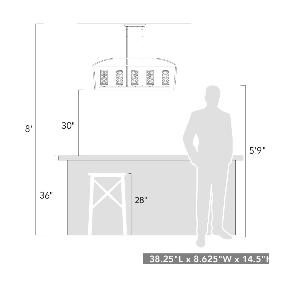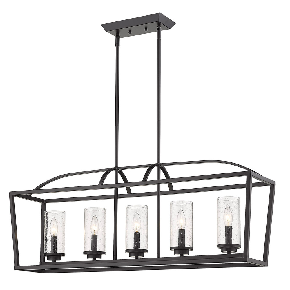 Bring modern elegance into your home with the Golden Lighting Mercer 5-light Island Light. Featuring a glass shade and a matte black frame, it creates a welcoming atmosphere. The seeded glass shade adds a touch of vintage character, infused with tiny air bubbles that create a unique, textural look reminiscent of antique glass. When illuminated, it catches the light beautifully, gently diffusing the bulb's glow for a warm and inviting ambiance. The matte black finish is the epitome of clean, modern style, offering an understated elegance that complements various decors from minimalist to bold contemporary. This fixture is rated for dry locations, making it ideal for indoor spaces such as bedrooms, living rooms, and hallways. It is compatible with sloped ceilings and features an adjustable height ranging from 17.5" to 59.5". Overall dimensions are 38.25"W x 14.5"H x 8.63"D, and it requires five E12 candelabra base bulbs (not included), with a maximum wattage of 60 per bulb. Elevate your space with this stylish island light that brings versatile lighting and contemporary flair.