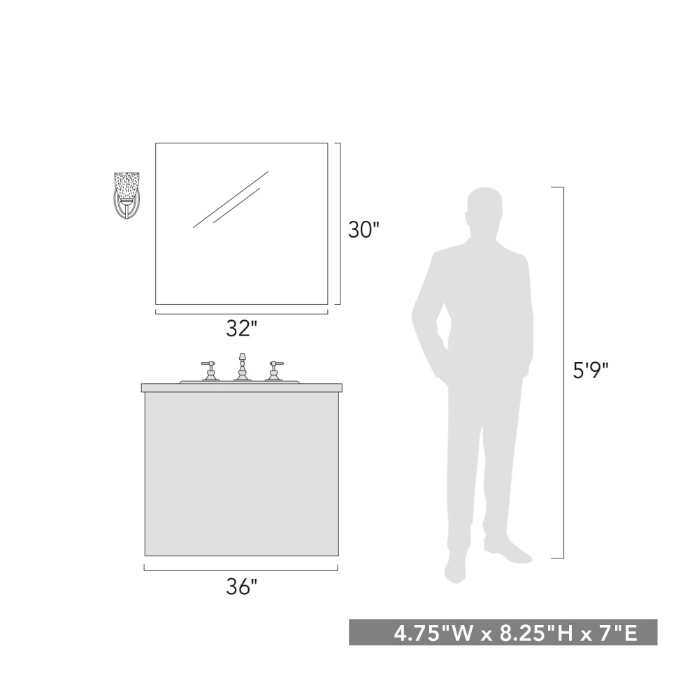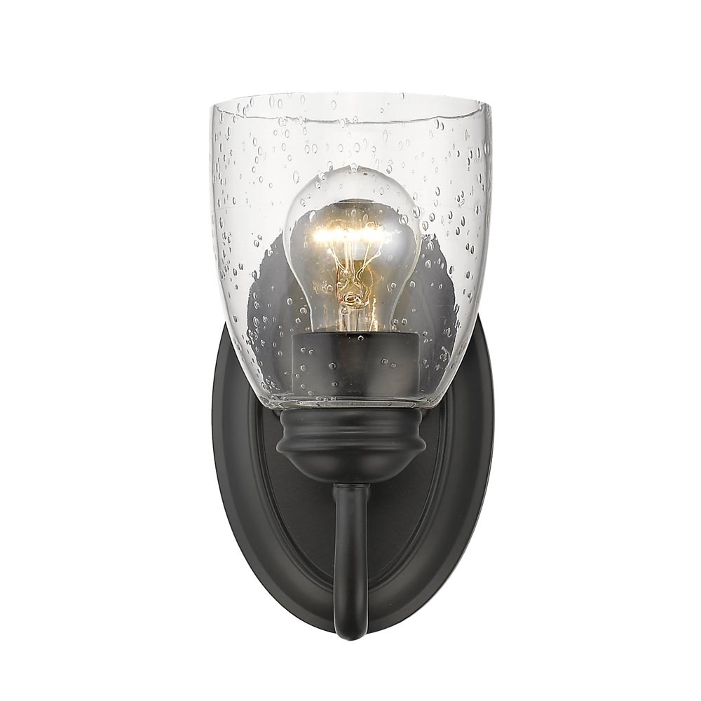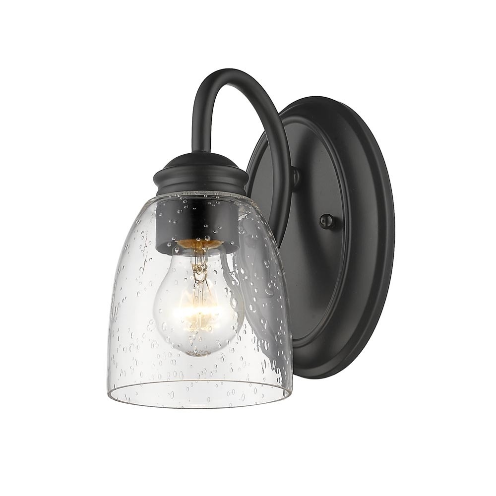 Bring timeless elegance into your home with the Golden Lighting Parrish 1-light Vanity in Matte Black. Featuring a glass shade and a sleek matte black frame, it creates a stylish yet functional atmosphere. The seeded glass shade is enhanced with tiny, infused air bubbles that add a vintage character and artisanal charm. The matte black finish is smooth and sophisticated, making it a versatile addition to various decor styles. This vanity light is damp location rated, ideal for spaces like bathrooms and laundry rooms. It uses 1 E26 medium base bulb (not included), with a maximum wattage of 60 per bulb, and dimensions of 4.75"W x 8.25"H x 7"D ensure it fits seamlessly in your space. Illuminate your bathroom with style and quality, thanks to the carefully crafted design of this fixture.
