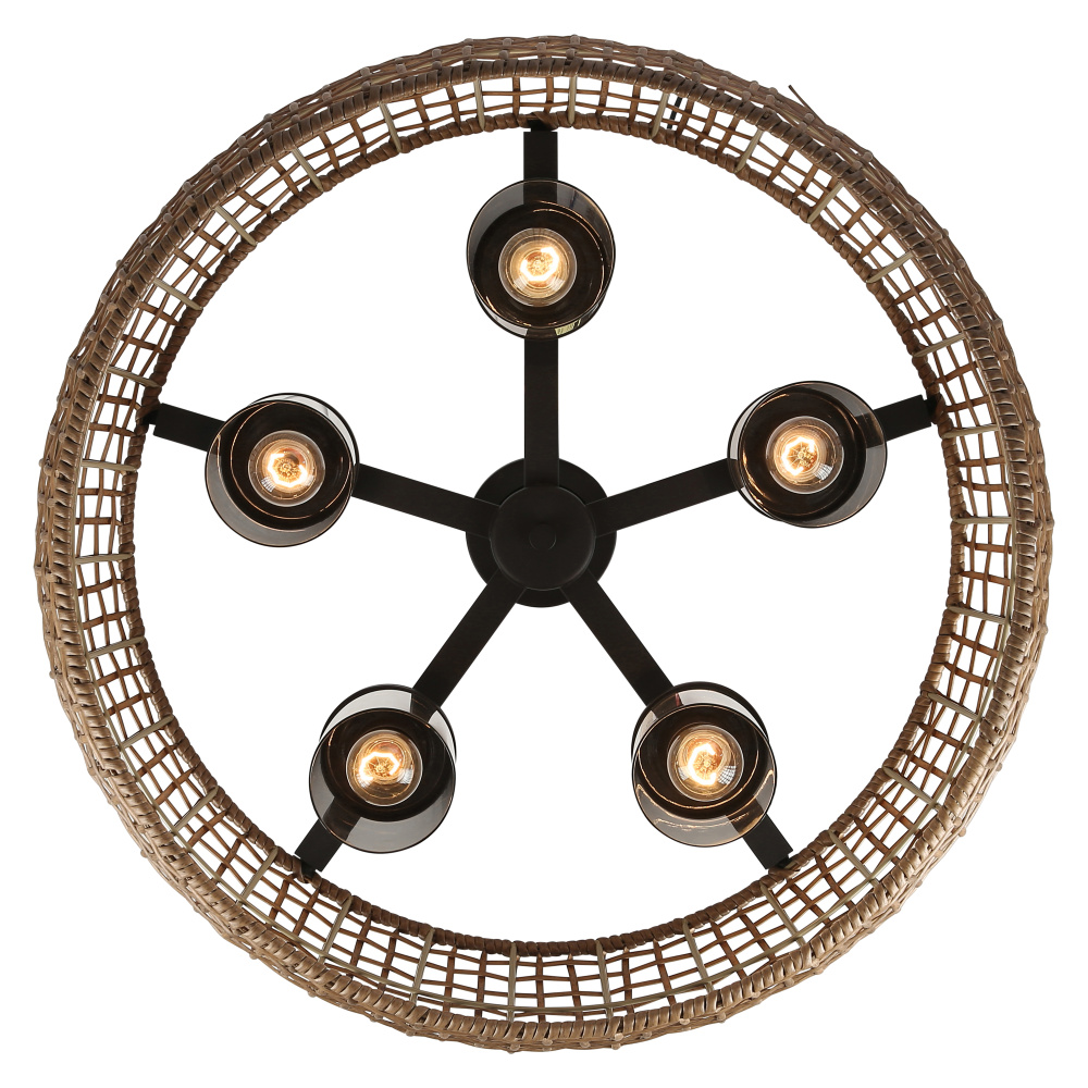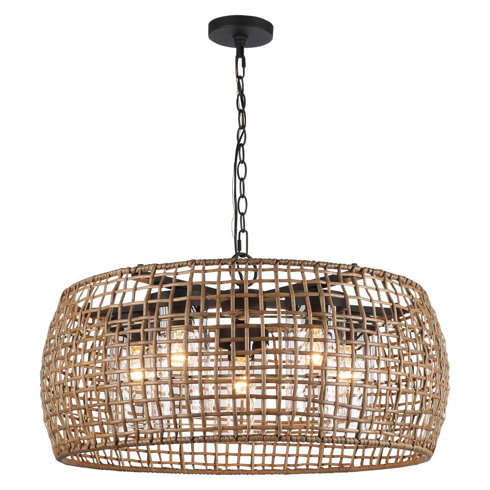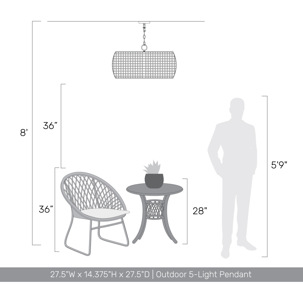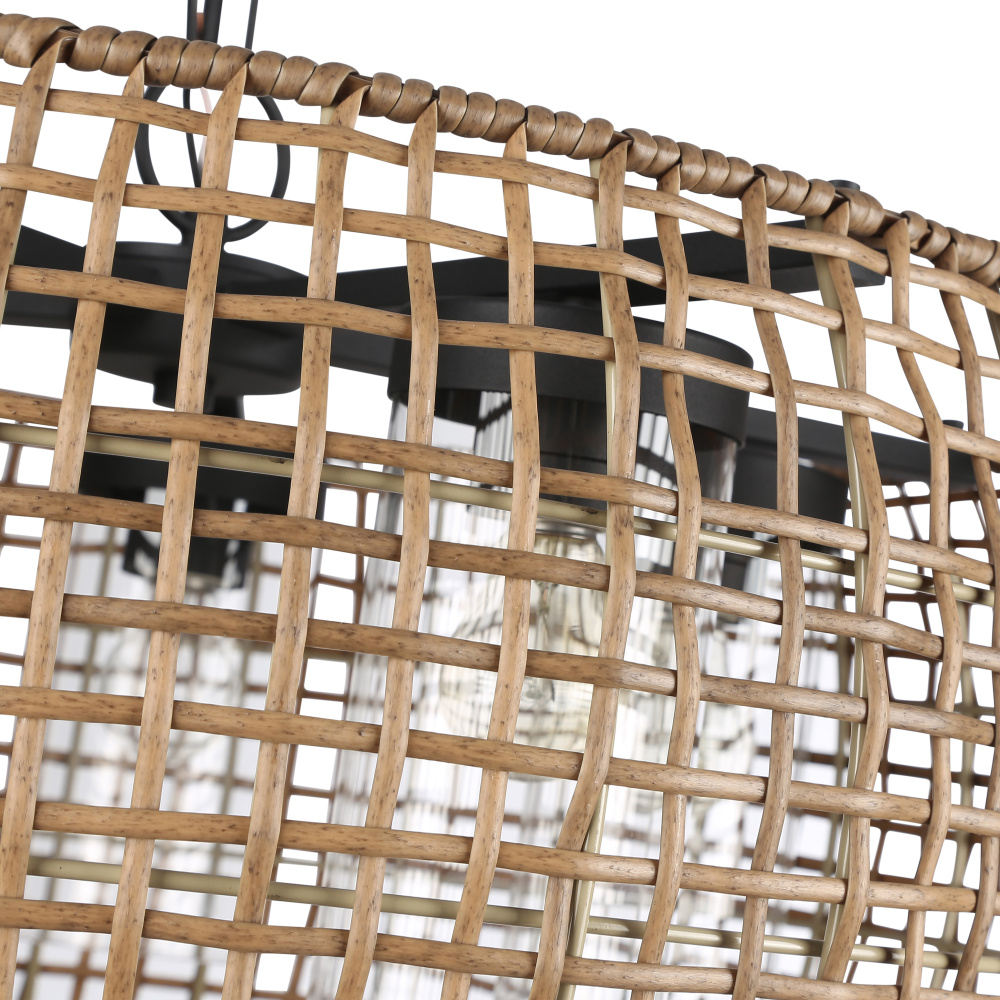Bring nature-inspired elegance into your home with the Golden Lighting Piper 5-light Outdoor Pendant in Natural Black. Featuring a wicker shade and a natural black frame, it creates a welcoming atmosphere. The Maple All-Weather Wicker shade adds a touch of coastal charm, showcasing a warm, honey-brown hue with natural variations. This handcrafted shade weaves from durable synthetic wicker into an open-weave pattern, allowing light to play beautifully, enhancing your space's organic feel. The natural black finish offers a softer touch compared to traditional blacks, boasting a chalky, matte texture that complements various styles from modern farmhouse to industrial. Perfect for covered outdoor spaces, this fixture is wet location rated and designed for direct exposure to the elements, while its convertible design allows for adjustable installation. It can be hung as a pendant or semi-flush mount, with a height adjustable from 17.375" to 91.25". Overall dimensions measure 27.5"W x 14.38"H x 27.5"D, requiring five E26 medium base bulbs (not included) with a maximum wattage of 100 per bulb. Close out your outdoor area with this stylish fixture that fuses quality craftsmanship with ecological design, illuminating your space with a relaxed yet elegant ambiance.