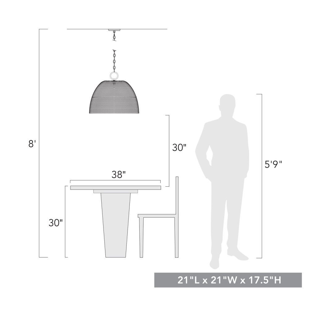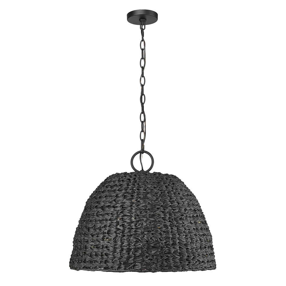 Bring nature-inspired elegance into your home with the Golden Lighting Rue 3-light Outdoor Pendant. Featuring a Wicker shade and a Natural Black frame, it creates a welcoming atmosphere. The silken black wicker shade offers a sophisticated interplay of shadow and sheen, with its exquisite hand-woven design adding texture and charm. Our Natural Black finish provides a softer, organic touch, reminiscent of raw, natural iron, bringing versatility from modern farmhouse to transitional styles. This fixture is wet location rated, designed to withstand direct exposure to the elements, making it perfect for uncovered outdoor areas. Installation is versatile with sloped-ceiling compatibility, and the adjustable height ranges from 17.5" to 93.875". Dimensions: 21"W x 17.5"H x 21"D. Requires 3 E26 Medium base bulbs (not included), max wattage of 60 per bulb. Embrace a free-spirited and stylish lighting solution with this durable and captivating fixture.