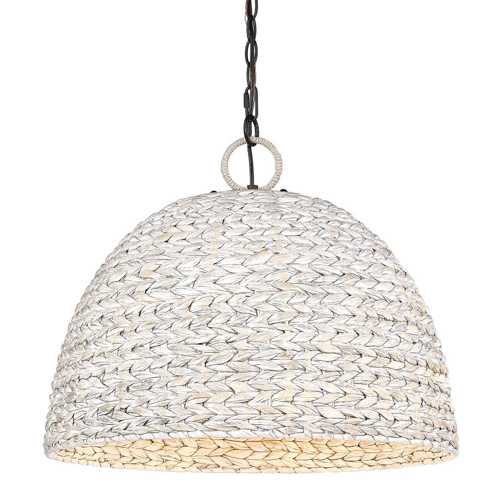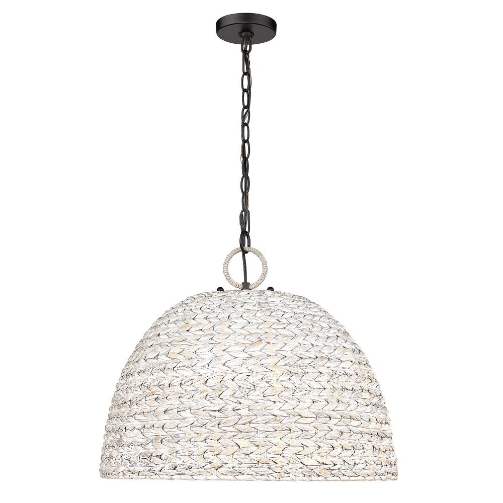 Bring bohemian elegance into your home with the Golden Lighting Rue 5-light Pendant in Matte Black and Rubbed Bronze shade. Featuring a rope shade and a matte black frame, it creates a welcoming atmosphere. The handwoven sweet grass shade adds an organic touch that enhances the overall aesthetic, while the rubbed bronze finish provides a warm, inviting glow. The matte black finish is timeless and versatile, offering a smooth texture that complements virtually any decor. Ideal for dry locations, this pendant is perfect for kitchens, dining rooms, and entryways. Its adjustable height allows for customization, with a range from 21.375" to 93.375". Requires 5 E26 Medium base bulbs (not included) with a maximum wattage of 60 per bulb. Dimensions are 21"W x 18.63"H x 21"D, making it a perfect centerpiece that blends functional lighting with artistic design.
