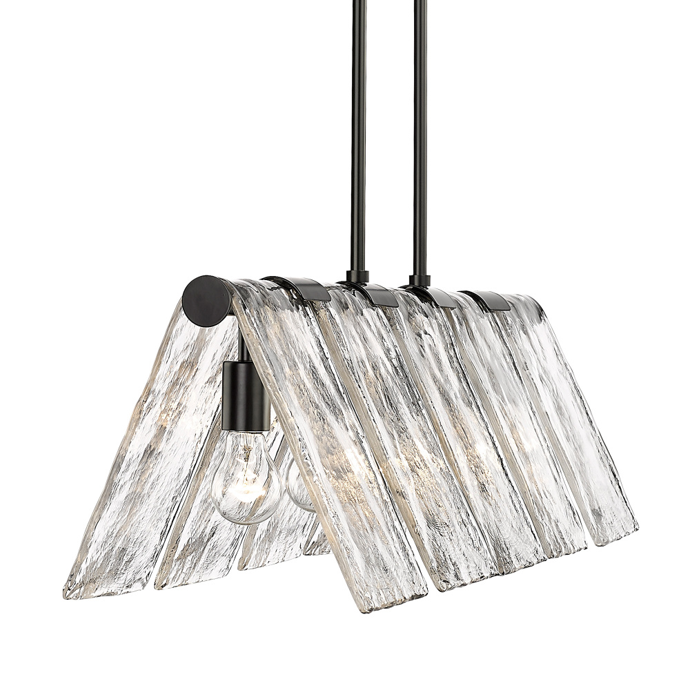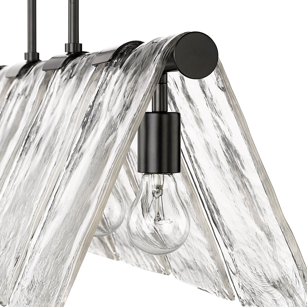 Bring modern industrial elegance into your home with the Golden Lighting Serenity 5-light Island Light in Matte Black. Featuring a glass shade and a matte black frame, it creates a welcoming atmosphere. The hammered water glass shade features an irregular and organic texture that beautifully refracts light, casting intricate patterns throughout your space. The matte black finish is timeless, offering a non-reflective surface that absorbs light, enhancing the sophistication of any room. Ideal for kitchen islands, this fixture is dry location rated, making it perfect for indoor spaces like bedrooms and hallways. Sloped-ceiling compatible and adjustable in height from 16.375" to 57.75", it can be customized to suit your needs. Overall dimensions are 37.88"W x 10.38"H x 10.13"D, and it requires 5 E26 medium base bulbs (not included), max 60 wattage per bulb. Illuminate your home with a high-quality, artisanal light fixture that stands out in any setting.