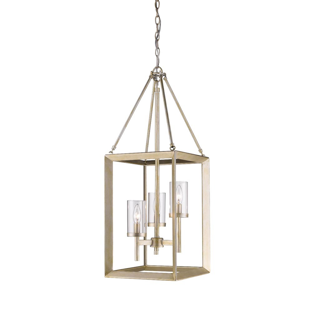 Bring timeless elegance into your home with the Golden Lighting Smyth 3-light Pendant in White Gold. Featuring a clear glass shade and a white gold frame, it creates a welcoming atmosphere. The clear glass shade allows for brilliant, unobstructed light, showcasing the beauty of the bulb and the fixture's design, while its polished finish adds a refined touch to any decor. Our White Gold finish offers a unique blend of warmth and coolness with a rustic texture, giving it the character of a cherished heirloom. Perfect for internal spaces such as bedrooms, living rooms, and dining rooms, this fixture is ideal for dry locations. It's sloped-ceiling compatible and has an adjustable height ranging from 35" to 107". The overall dimensions are 12"W x 32"H x 12"D and it requires three E12 candelabra base bulbs (not included) with a maximum of 60 watts per bulb. This pendant light adds a stylish statement to various settings, enhancing your home with quality and elegance.