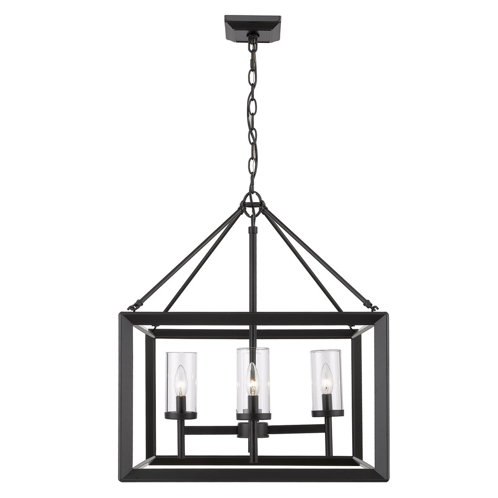 Bring modern elegance into your home with the Golden Lighting Smyth 4-light Chandelier. Featuring a glass shade and a matte black frame, it creates a welcoming atmosphere. The glass shade offers brilliant, unobstructed light, enhancing the chandelier's sleek design. Its transparent nature allows the beauty of the bulb to shine through while providing ample illumination. The matte black finish is the epitome of clean, modern style, complementing virtually any decor from minimalist to bold contemporary. Ideal for dry locations, this chandelier makes a grand impression in dining rooms and foyers and can be easily installed on sloped ceilings. With an adjustable height ranging from 28" to 99", it fits various spaces seamlessly. Overall Dimensions: 21"W x 26"H x 21"D. Requires 4 E12 Candelabra base bulbs (not included) at a maximum wattage of 60 per bulb. Enhance your decor with the perfect blend of sophistication and quality from Golden Lighting.