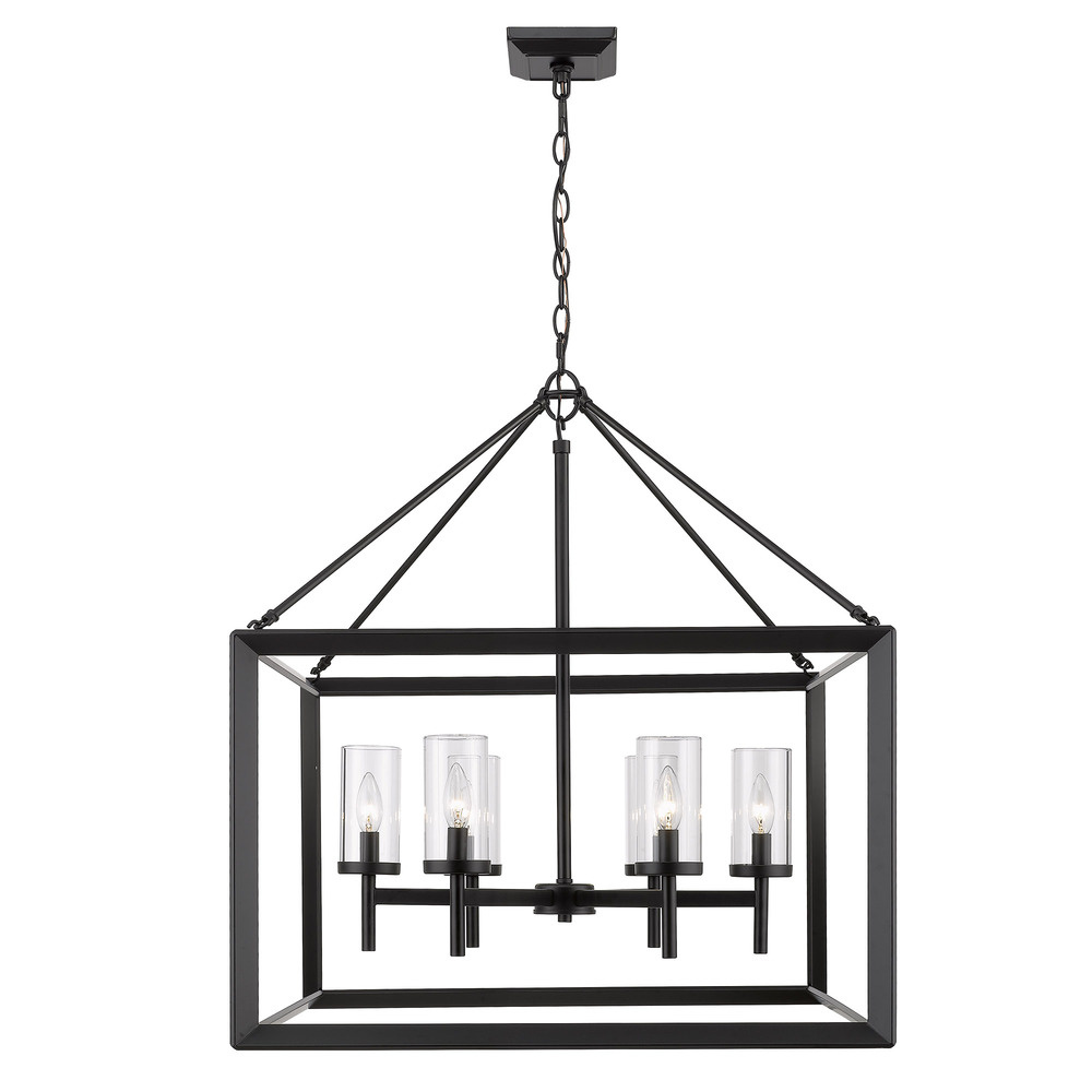 Elevate your space with Contemporary sophistication. Bring Modern elegance into your home with the Golden Lighting Smyth 6-light Chandelier. Featuring a glass shade and a Matte Black frame, it creates a welcoming atmosphere. The Clear Glass shade offers unobstructed light that enhances the beauty of the fixture. Its polished finish allows the design to shine through while providing bright illumination. The Matte Black finish is timeless and versatile, absorbing light and creating a soft, sophisticated look. Ideal for dining rooms and foyers, this chandelier is Dry Location Rated, ensuring safety in indoor spaces away from moisture. It's also Sloped-Ceiling Compatible and Adjustable in Height, accommodating various ceiling types and customizing the hanging length to suit your space. Overall Dimensions: 26.63"W x 30.75"H x 26.63"D. Requires 6 E12 Candelabra base bulbs (not included), with a maximum wattage of 60 per bulb. Style your home with quality craftsmanship and timeless design that makes a grand impression.