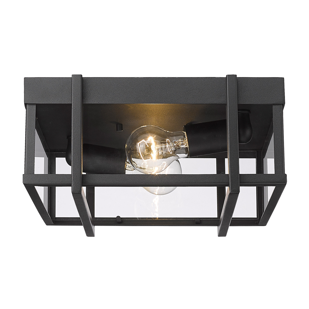 Bring timeless charm to your outdoor spaces with the Golden Lighting Tribeca 2-light Outdoor Ceiling Light. Featuring a clear glass shade and a natural black frame, it creates an inviting illumination for porches and outdoor kitchens. The clear glass shade allows brilliant light distribution, enhancing the aesthetics of your space. Its durable design caters to the elements while providing a high-quality look. Perfect for overhead coverage in porches, gazebos, and outdoor kitchens, this damp location rated fixture is designed to handle occasional moisture exposure. Overall Dimensions: 13"W x 5.5"H x 12"D. Requires 2 E26 Medium base bulbs (not included), with a maximum wattage of 60 per bulb. Enhance your outdoor environment with the elegance and quality of Golden Lighting.