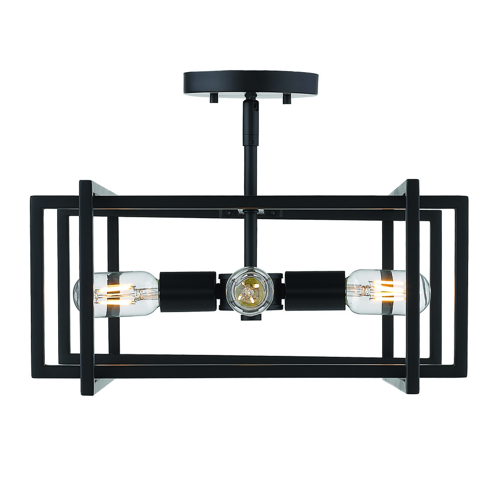 Bring modern elegance into your home with the Golden Lighting Tribeca 4-light Semi-Flush Mount. With its matte black frame, it creates a welcoming atmosphere in your space. This fixture features a clean geometric design that reflects a minimalist aesthetic while providing bright illumination. The matte black finish absorbs light, creating a soft look that complements various decor styles. Suitable for entryways, bedrooms, kitchens, and living areas with mid-height ceilings, this damp location rated light is ideal for spaces that may experience occasional moisture. Overall Dimensions: 15.5"W x 11.25"H x 15.5"D. Requires 4 E26 Medium base bulbs (not included), with a maximum wattage of 60 per bulb. Elevate your décor with the quality and sophistication of Golden Lighting.