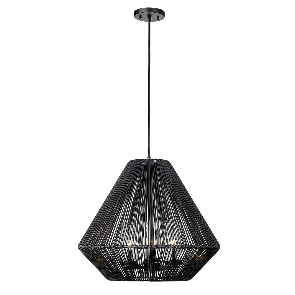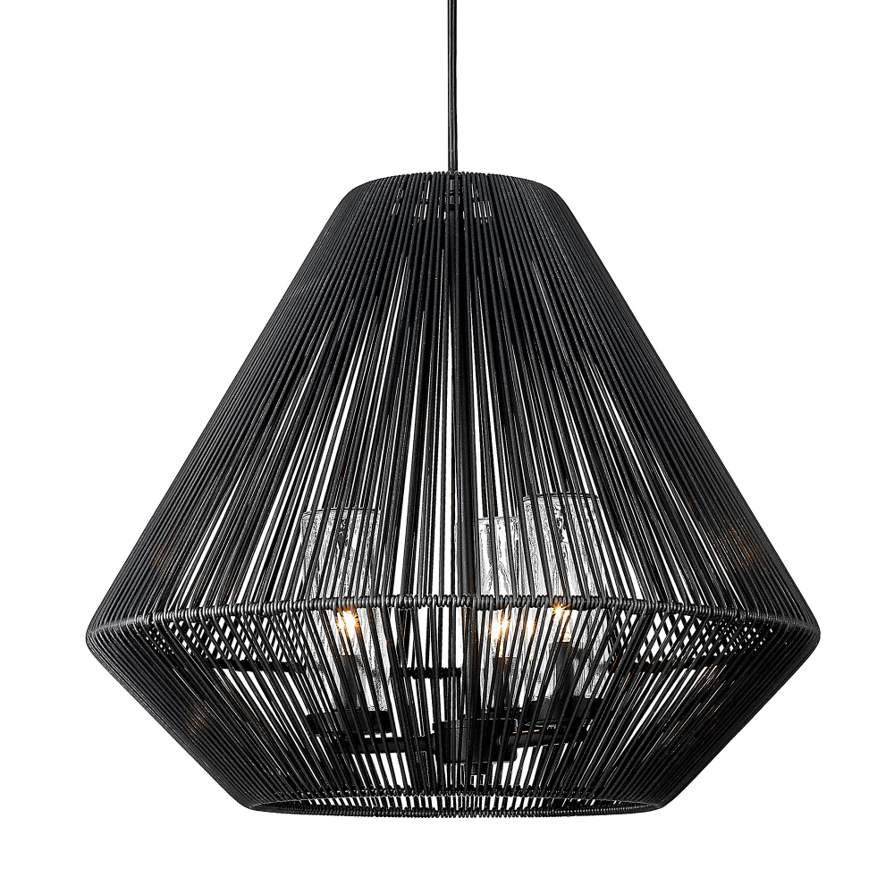 Bring artistic elegance to your outdoor spaces with the Golden Lighting Valentina 3-light Outdoor Pendant. Featuring a wicker shade and a natural black frame, it enhances your exterior while providing welcome illumination. The matte black wicker shade provides a sophisticated take on natural materials, with its tightly woven, textured pattern allowing filtered ambient light to create an inviting atmosphere in your outdoor areas. The natural black finish offers a soft and organic aesthetic, resembling dark charcoal with a chic, matte surface. This understated finish suits styles ranging from modern farmhouse to transitional. This pendant is wet location rated, designed to withstand the elements, making it perfect for uncovered outdoor areas. It features a sloped-ceiling compatible design and an adjustable height from 19.625" to 129.625", ensuring a perfect fit for any space. Overall dimensions: 20.75"W x 18.25"H x 20.75"D. Requires 3 E12 candelabra base bulbs (not included), with a maximum wattage of 60 per bulb. Enjoy the balance of stylish design and durability with this outdoor pendant that brings charm and character to your patios or porches.