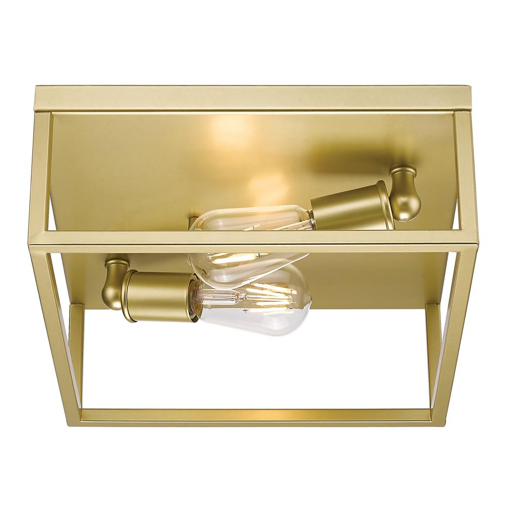 Bring contemporary warmth into your home with the Golden Lighting Wesson 2-light Flush Mount in Olympic Gold. Featuring no shade and a luxurious olympic gold frame, it creates a welcoming atmosphere for all spaces. The robust, open metal cage structure highlights the exposed bulbs, embodying the beauty of function with a modern twist. Our olympic gold finish offers a soft, pale gold hue with a creamy surface that diffuses light beautifully, elevating your decor with a chic touch. Ideal for low ceilings in hallways, closets, laundry areas, and bathrooms, this flush mount is damp location rated, making it suitable for areas with occasional moisture, like covered porches. It requires 2 E26 Medium base bulbs (not included), with a maximum wattage of 60 per bulb. Overall Dimensions: 12"W x 5"H x 12"D. This stylish design effortlessly blends into your decor while providing ample illumination and quality craftsmanship.