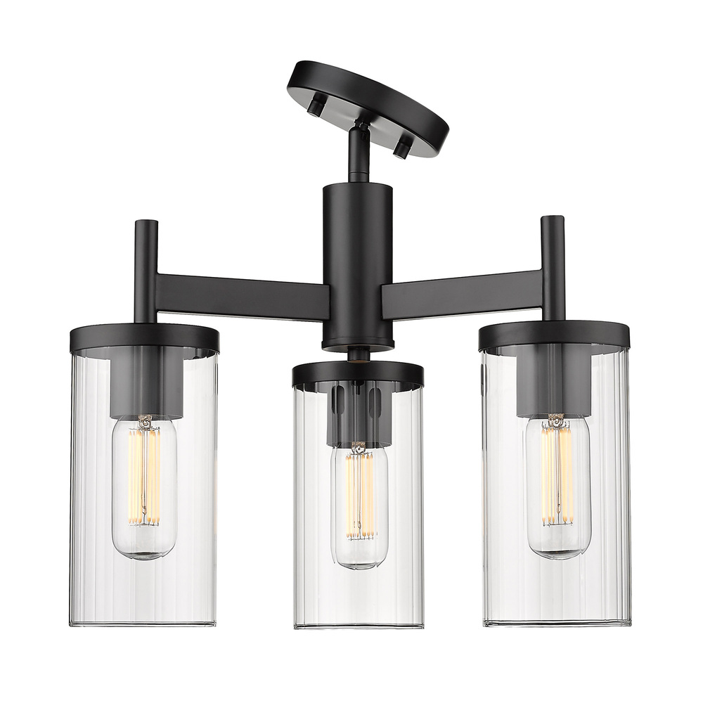 Bring modern elegance into your home with the Golden Lighting Winslett 3-light Semi-Flush Mount. Designed with a clear glass shade and a matte black frame, it radiates style while enhancing your living space. This exquisite glass shade features a ribbed texture that beautifully refracts light, creating an inviting glow that enriches your decor. The clear ribbed glass is a perfect blend of modern and classic, adding depth and sophistication to any room. Featuring a matte black finish that absorbs light while maintaining a sleek surface, this semi-flush mount is damp location rated and suitable for areas with occasional moisture. Ideal for entryways, kitchens, and bedrooms, it is designed for safe and secure installation on sloped ceilings. Dimensions: Overall dimensions are 16.5"W x 15"H x 16.5"D. Requires three E26 medium base bulbs (not included), with a maximum wattage of 60 per bulb. Complete your home's aesthetic with the Golden Lighting Winslett Collection, where style meets functionality.