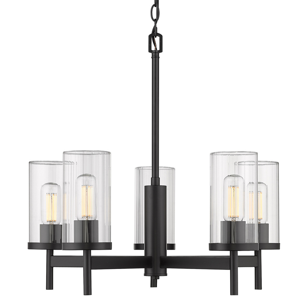 Transform your home with the sophisticated elegance of the Golden Lighting Winslett 5-light Chandelier. This striking chandelier features a clear glass shade and a matte black frame, bringing a touch of drama to your decor. The clear glass shade flaunts a ribbed texture that refracts light beautifully, filling your space with a soft, warm glow. Its unique design effortlessly balances modern and classic aesthetics, enhancing the overall ambiance of any room. Crafted with a matte black finish that absorbs light, this chandelier is as practical as it is stylish. It is dry location rated, suitable for indoor areas such as dining rooms or living spaces. The installation is simple, allowing for sloped ceilings and adjustable height options ranging from 26.75" to 95.75". Dimensions: Overall dimensions are 23.75"W x 23"H x 23.75"D. Requires five E26 medium base bulbs (not included), with a maximum wattage of 60 per bulb. Elevate your home with the superior craftsmanship of the Golden Lighting Winslett Collection, where every detail is designed for lasting quality.