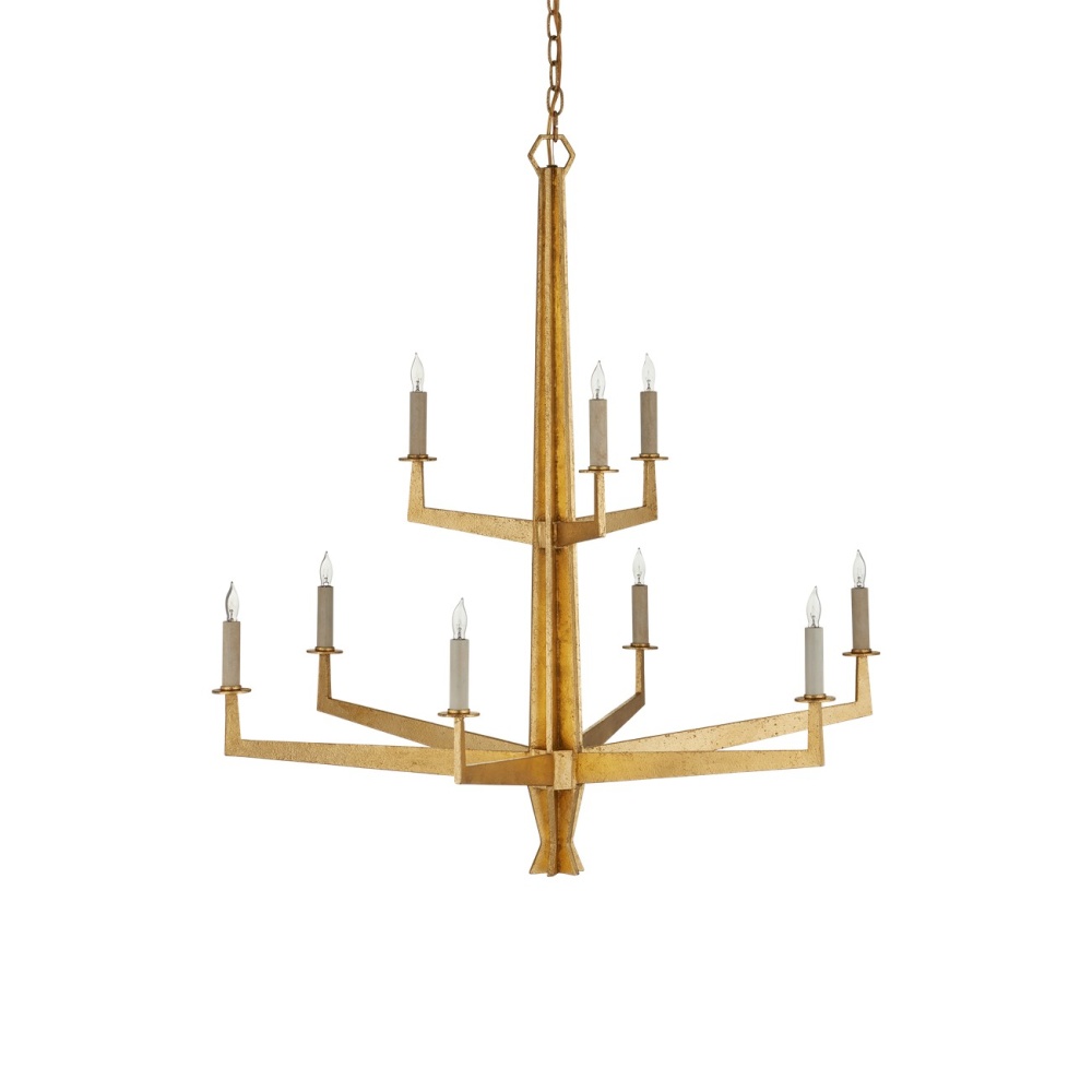 The Goldfinch Large Chandelier is a complex geometrical puzzle that is worked one arm at a time. Each of the pieces of wrought iron is forged individually and welded to the frame to create the articulating profile. The statuesque fixture has a washed Lucerne gold finish, which has a slight texture to it because it is splattered on after the chandelier is constructed. The shades shown here are sold separately. Adjustable from 44.5" to 112.5" with use of included chain/rod kit/cable. If your space calls for a longer drop, additional chain/rods/cable is available for purchase.