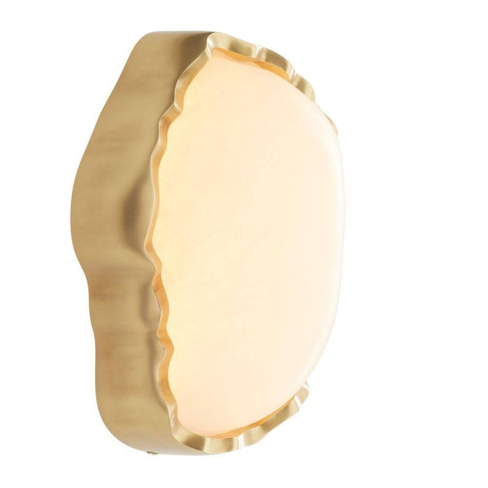 Like a shaped and polished cabochon, a freeform fixture of white alabaster is clasped in a setting of antique brass. Recalling a precious gem, this integrated LED fixture makes a stylish accent when paired or installed in multiples along a hallway. Damp-rated, although limited covered outdoor areas may affect finish. Finish will vary.