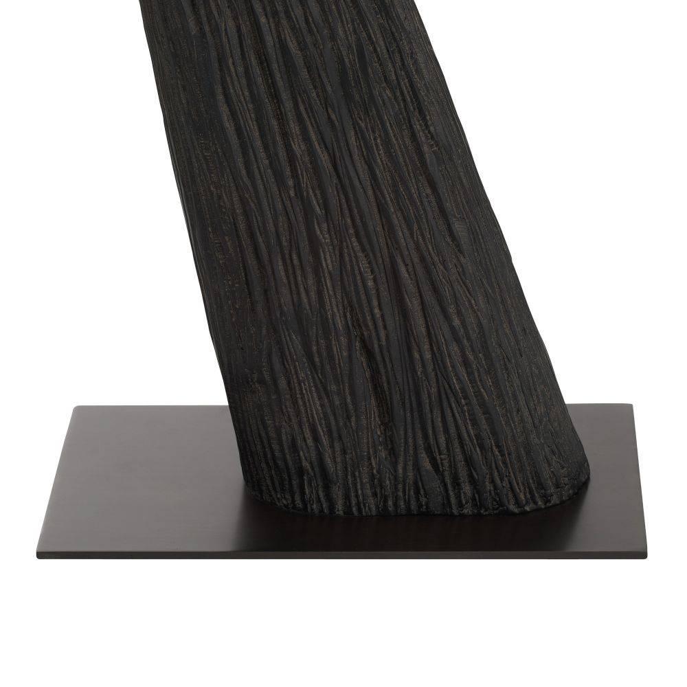 A dynamic accent piece, the Graceland's angular silhouette recalls a lightning bolt. The zig-zag form of ebony resin is finished in a faux bois-inspired texture, accented by a bronze-plated steel base and matching hardware. Topped with a rectangular off-white linen shade lined in white cotton.
