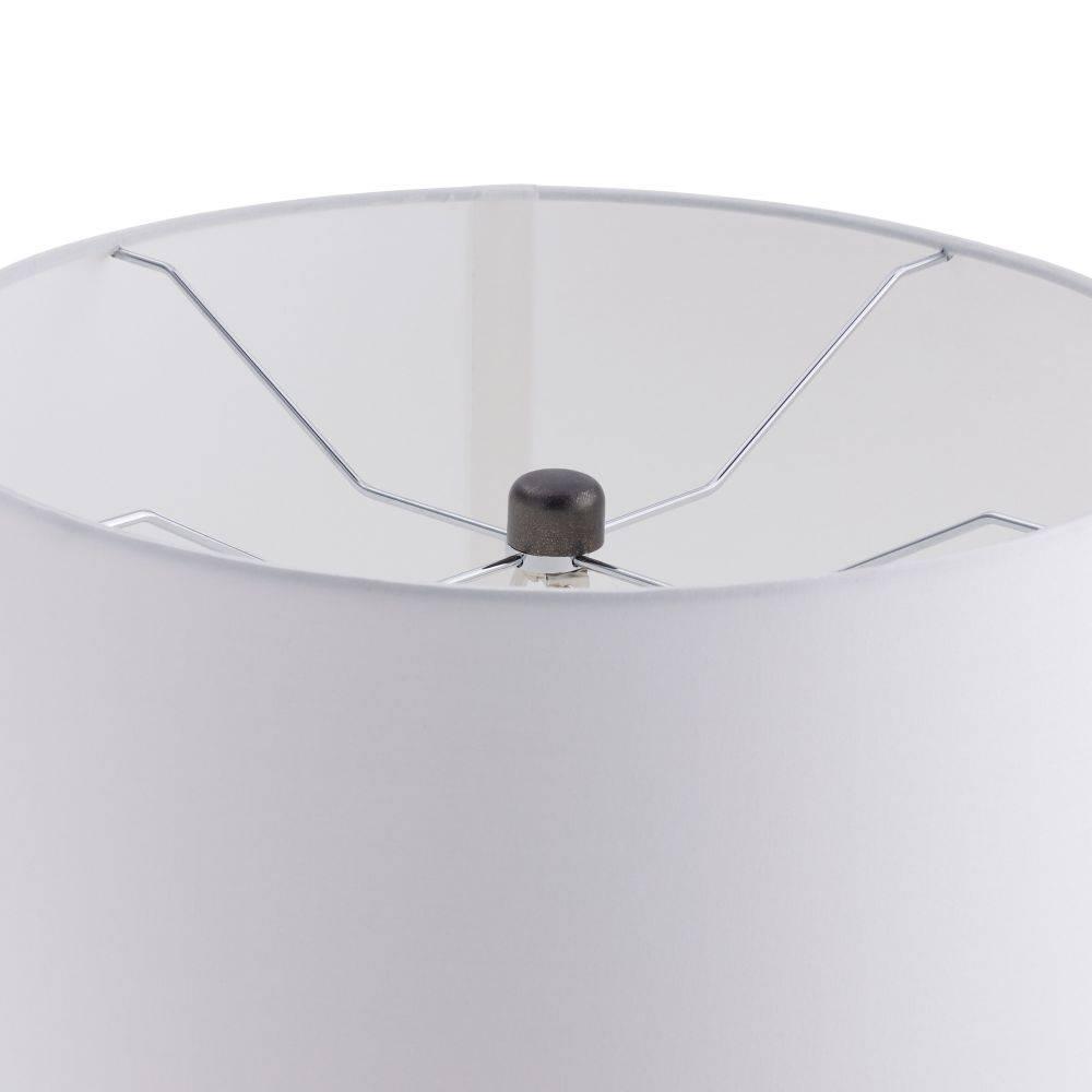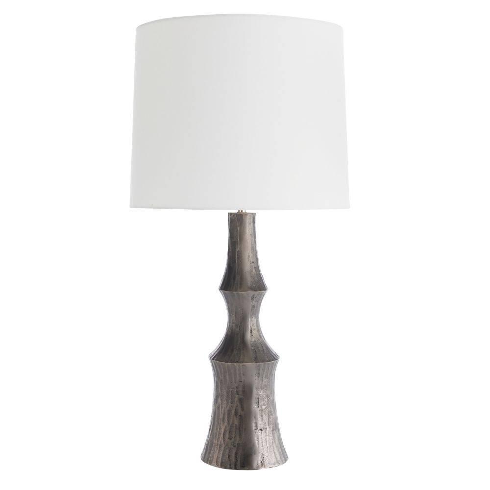 An iconic silhouette of cast-graphite aluminum is carved and seamed for textural interest. Appearing black at first sight, the tree-bark-inspired finish adds a visual depth that effortlessly draws the eye. Topped with an off-white cotton drum shade lined in off-white cotton and matching graphite finial.