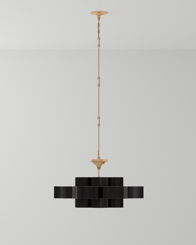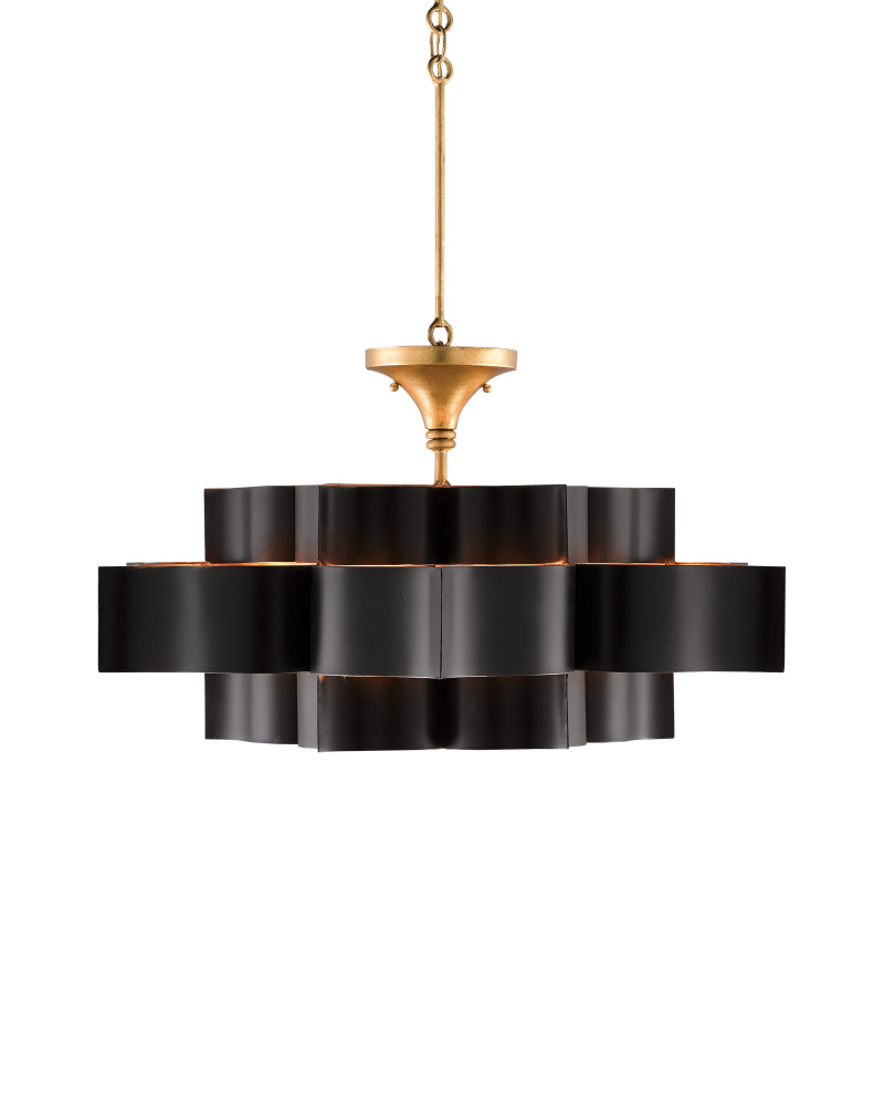 The Grand Lotus Black Large Chandelier receives its majestic good looks from a combination of stunning workmanship and a mix of satin black and contemporary gold leaf finishes. The black chandelier is skillfully fashioned from wrought iron. Adjustable from 16" to 100" with use of included chain/rod kit/cable. If your space calls for a longer drop, additional chain/rods/cable is available for purchase.