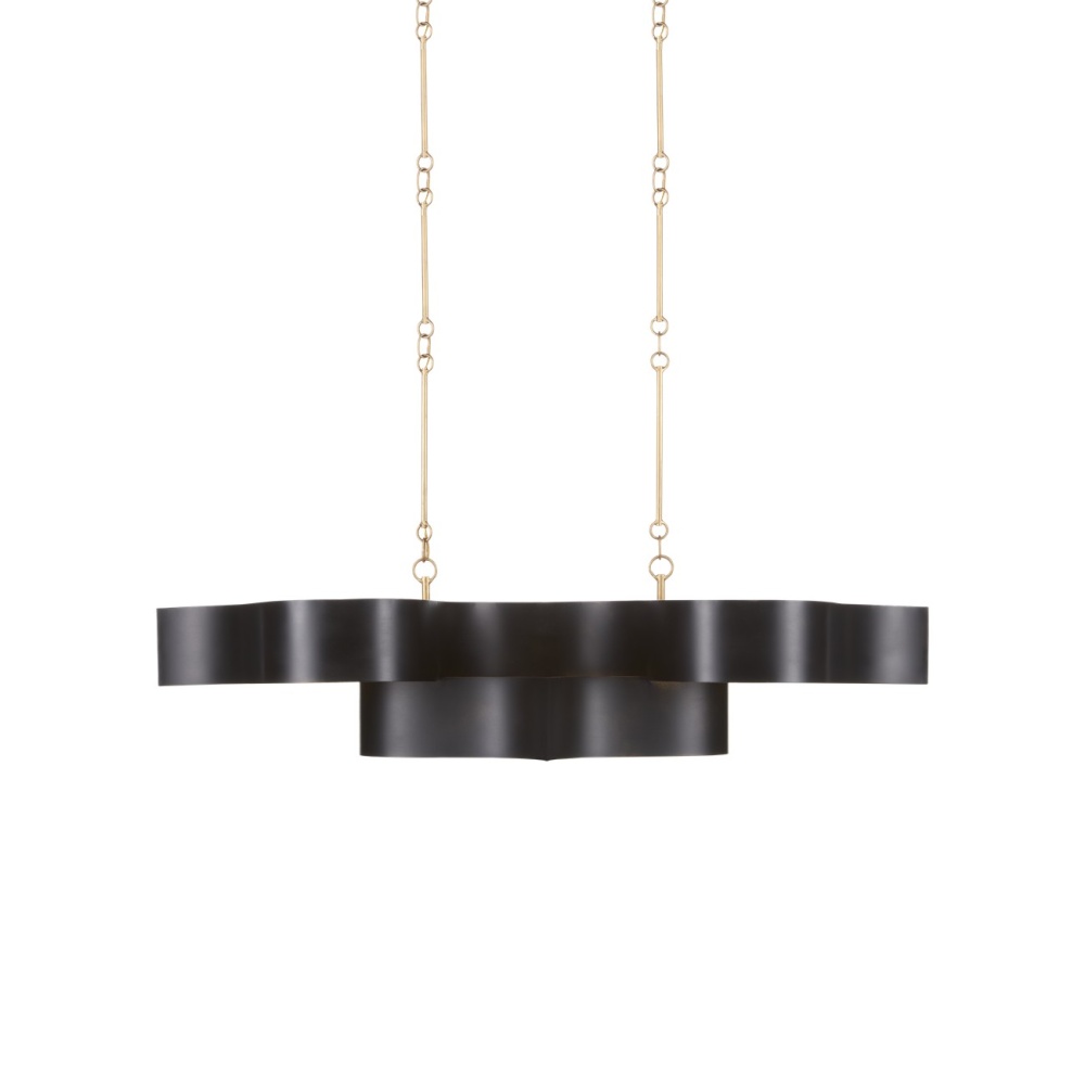 The Grand Lotus Black Oval Chandelier receives its majestic good looks from a combination of stunning workmanship and a mix of satin black and contemporary gold leaf finishes. The black chandelier is skillfully fashioned from wrought iron. Adjustable from 17" to 58" with use of included chain/rod kit/cable. If your space calls for a longer drop, additional chain/rods/cable is available for purchase.