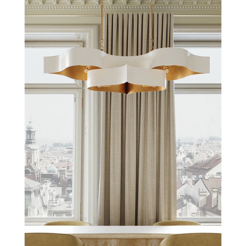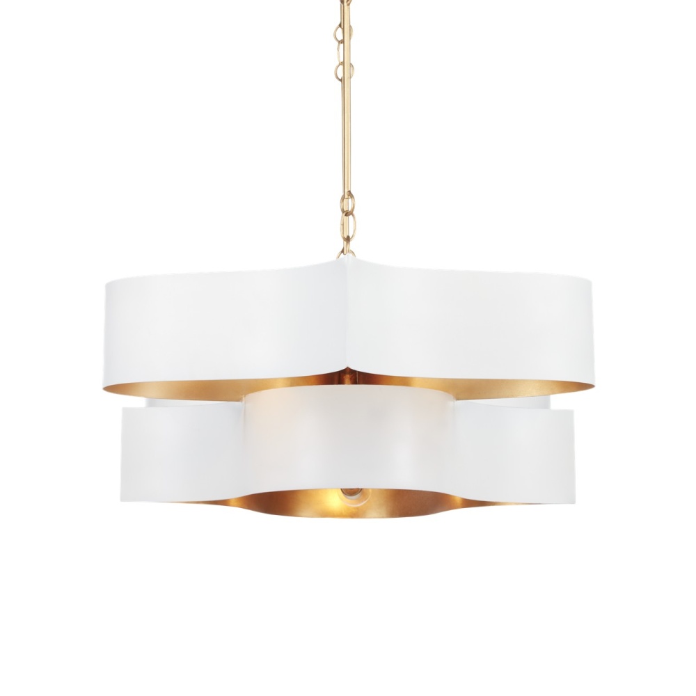 The Grand Lotus White Oval Chandelier receives its majestic good looks from a combination of stunning workmanship and a mix of sugar white and contemporary gold leaf finishes. The white chandelier is skillfully fashioned from wrought iron. Adjustable from 17" to 58" with use of included chain/rod kit/cable. If your space calls for a longer drop, additional chain/rods/cable is available for purchase.