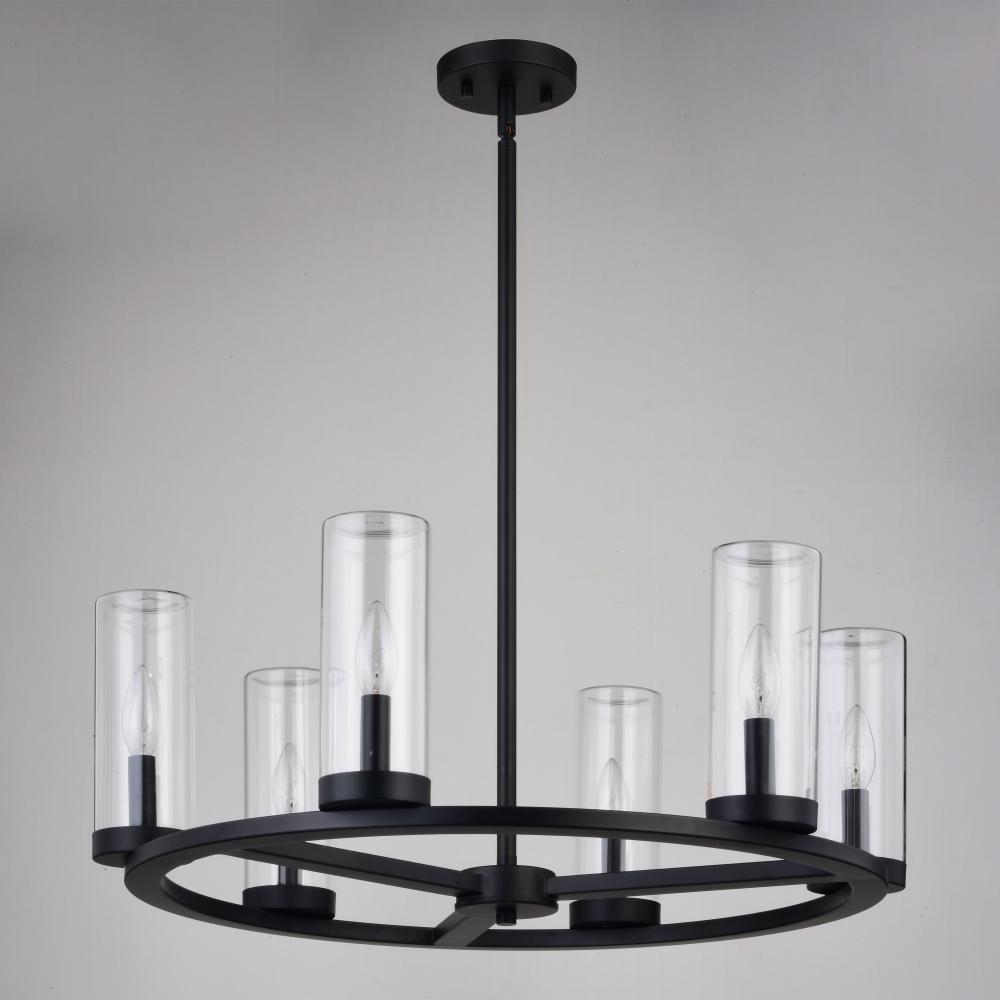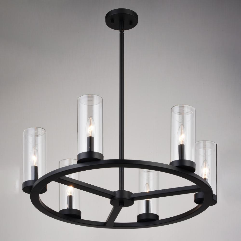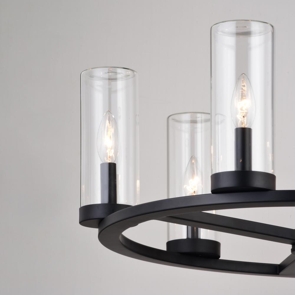 The Grantley collection is the perfect addition to your indoor or covered outdoor spaces. Long clear enclosed glass cylinders accentuate the clean, contemporary look of this collection. A ring with metal discs in a striking matte black finish support the glass cylinders showcasing a generous display of light. Add this chandelier light to any dining, living or covered outdoor space where extra light is needed for that stylish touch.