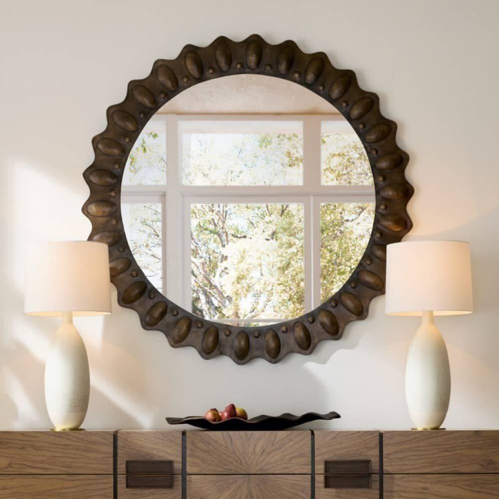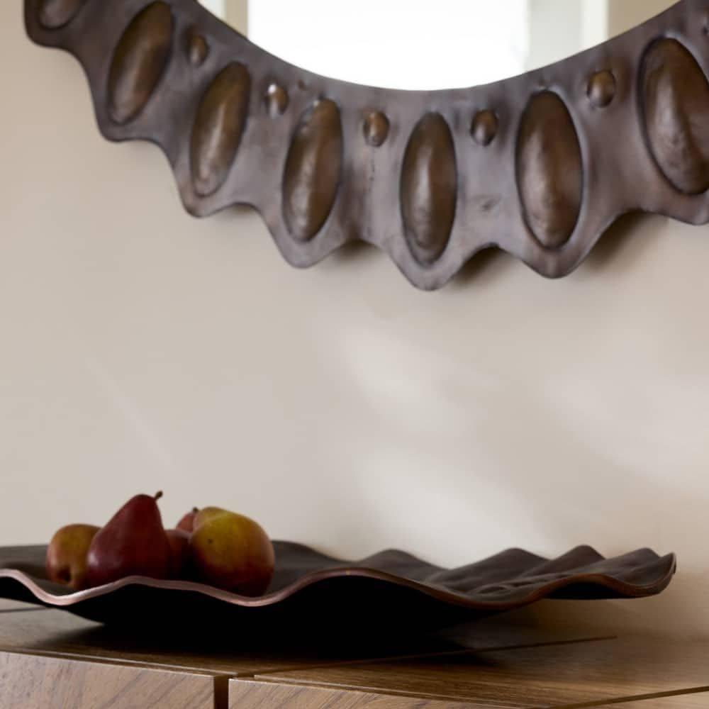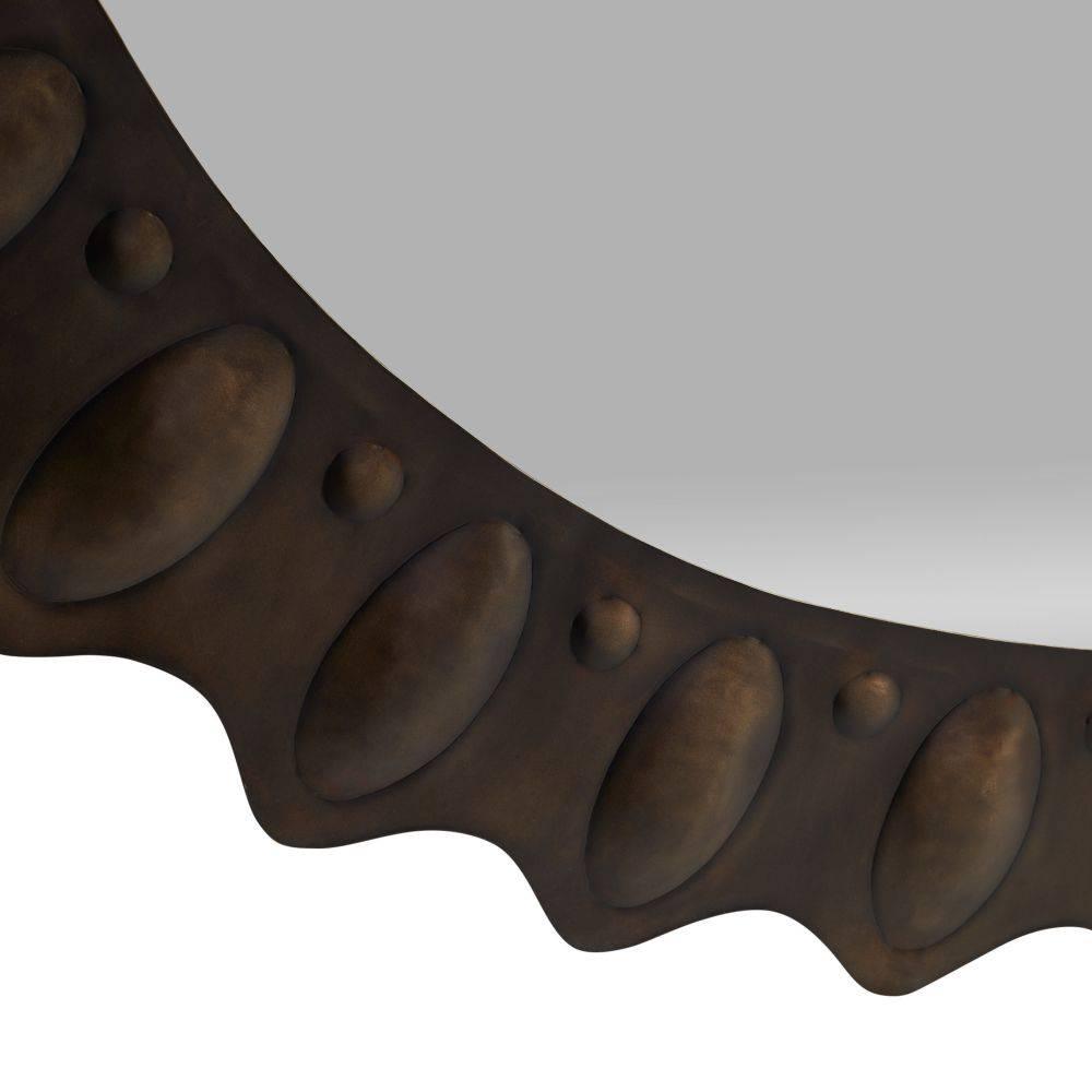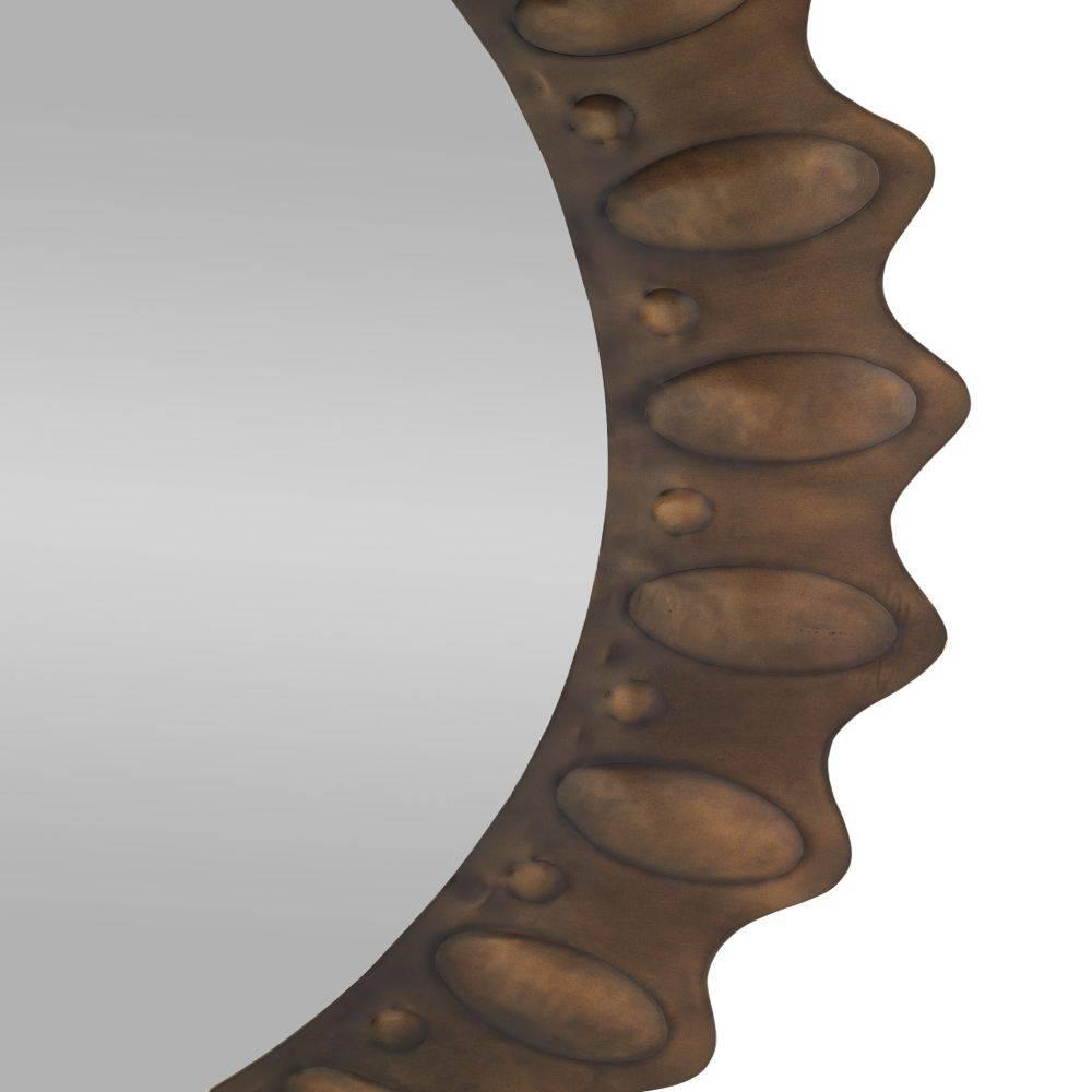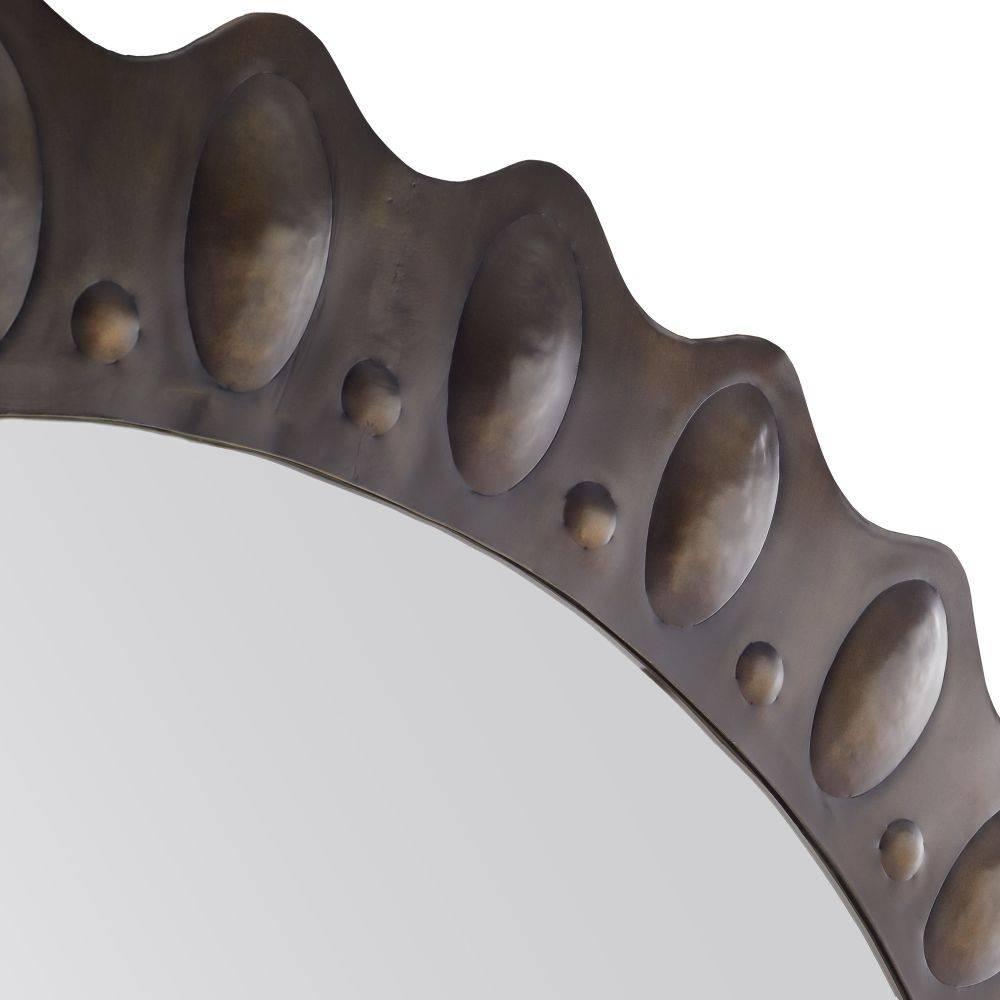 A blend of rustic and contemporary styles, our hand-hammered mirror was inspired by the texture of an ancient shield. Crafted of bronze-plated iron and overscaled in size, it has a handmade quality that adds dimension to any room. Finished with a cleat attachment for secure hanging. Finish will vary.