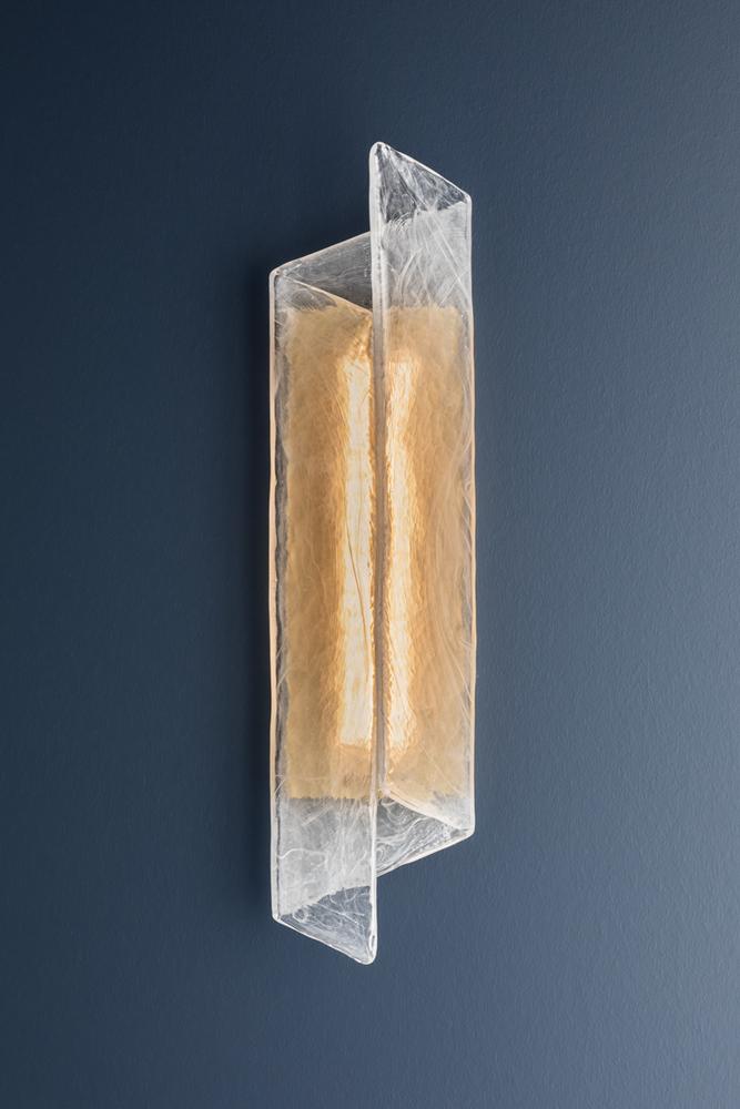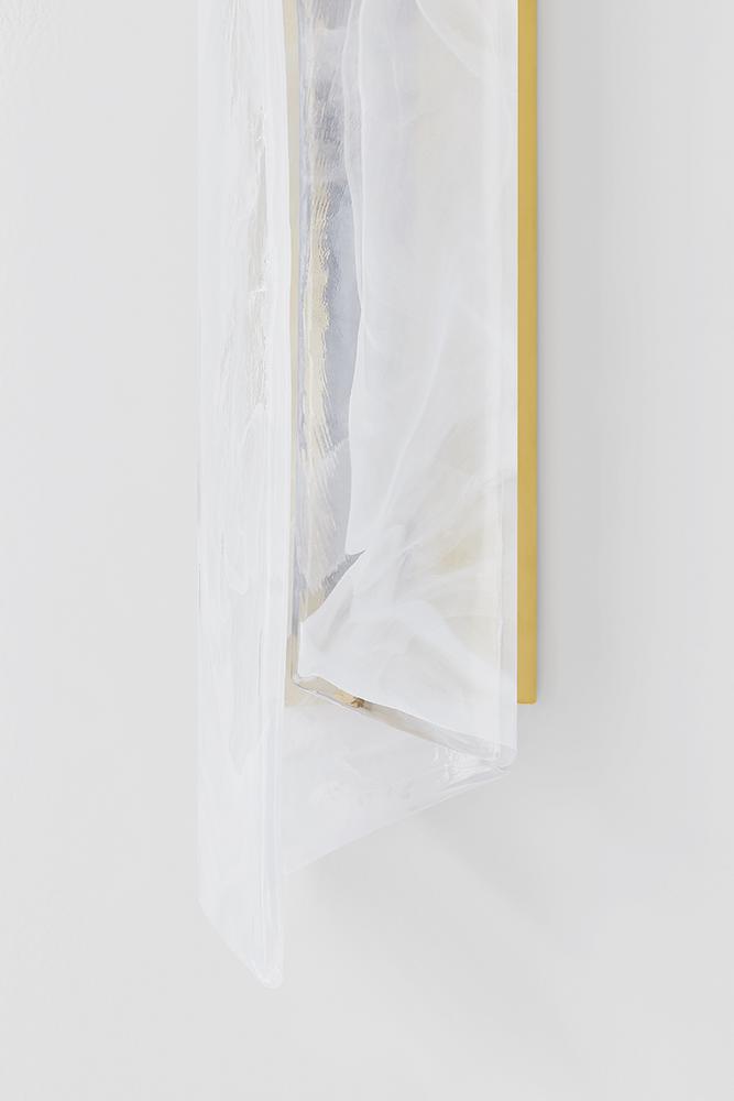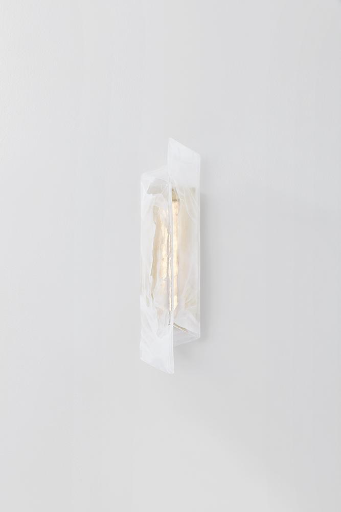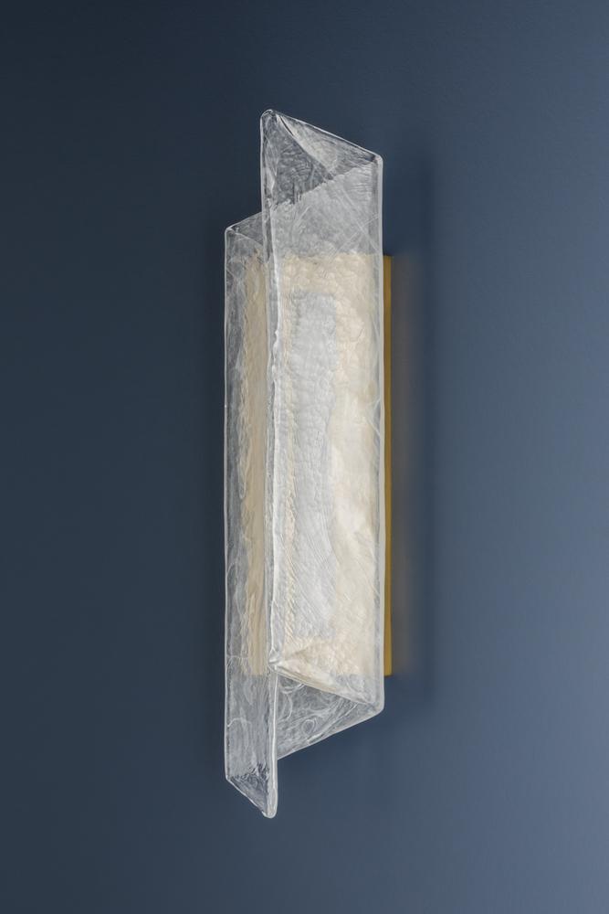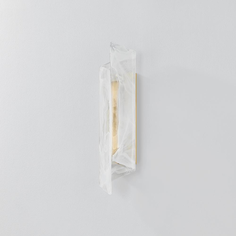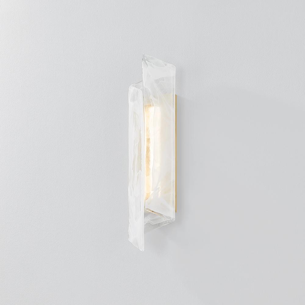 A single piece of folded piastre glass serves as the basis for this captivating sconce. The distinctive white swirl pattern recalls smoke, while the transparent glass allows the Aged Brass metalwork to glint through when illuminated. The off-axis fold of the shade adds a dynamic, directional shape to the angular form. Best of all, the glass can be hung in either direction.