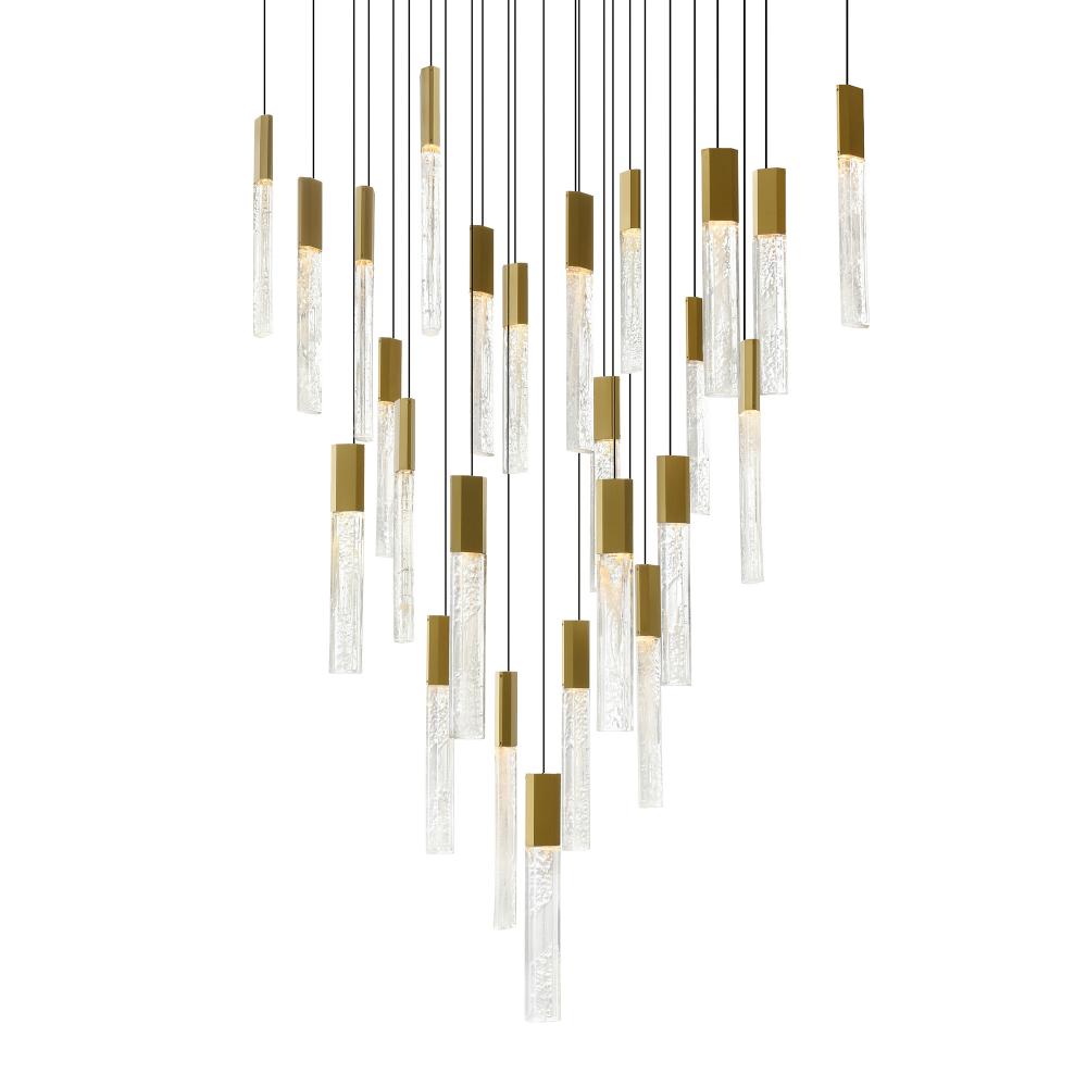 Elegant Modern Design Enhance your living or dining room with this sleek 28-inch brass chandelier, featuring a contemporary design and textured handmade glass for a sophisticated touch.