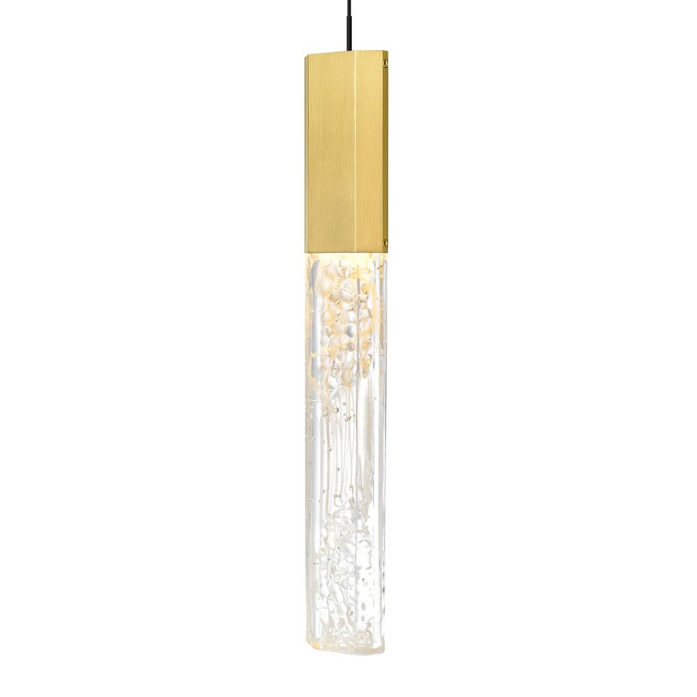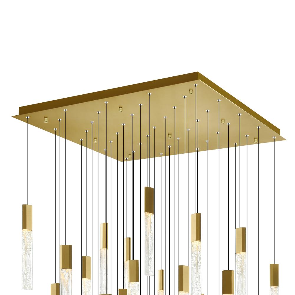 Elegant Modern Design Enhance your living or dining room with this sleek 36-inch brass chandelier, featuring a contemporary design and textured handmade glass for a sophisticated touch.