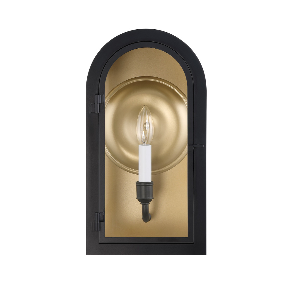 Looking for unique outdoor lighting? Look no further than the exquisite Savoy House Grotto 1-light outdoor wall sconce. Inside its arched structure, a light source is held behind a door and is viewable on three sides through panes of clear glass. Circular detailing behind the bulb concentrates and directs the light, creating an eye-catching feature. The backplate is finished in Vintage Gold, which helps to create a warm glow. Two-tone allure comes from the combination of the white candle cover and Matte Black finish. Grotto is 15" in height, 8" in width and extends 6.5" from the wall. Uses one candelabra size bulb of up to 60 watts. Bulb not included. Grotto is wet area rated for use in covered or uncovered outdoor areas.