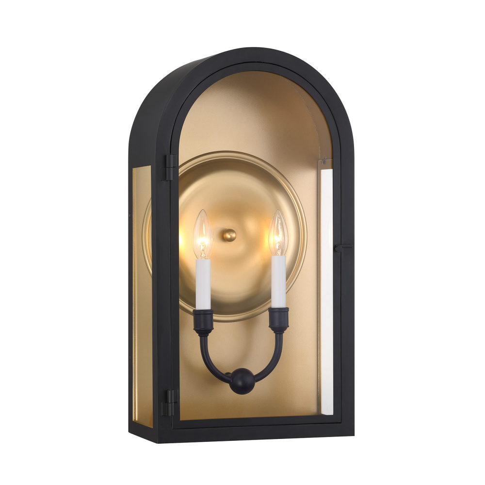 Looking for unique outdoor lighting? Look no further than the exquisite Savoy House Grotto 2-light outdoor wall sconce. Inside its arched structure, light sources are held behind a door and are viewable on three sides through panes of clear glass. Circular detailing behind the bulbs concentrates and directs the light, creating an eye-catching feature. The backplate is finished in Vintage Gold, which helps to create a warm glow. Two-tone allure comes from the combination of the white candle covers and Matte Black finish. Grotto is 22.5" in height, 12" in width and extends 6.5" from the wall. Uses two candelabra size bulbs of up to 60 watts per bulb. Bulbs not included. Grotto is wet area rated for use in covered or uncovered outdoor areas.