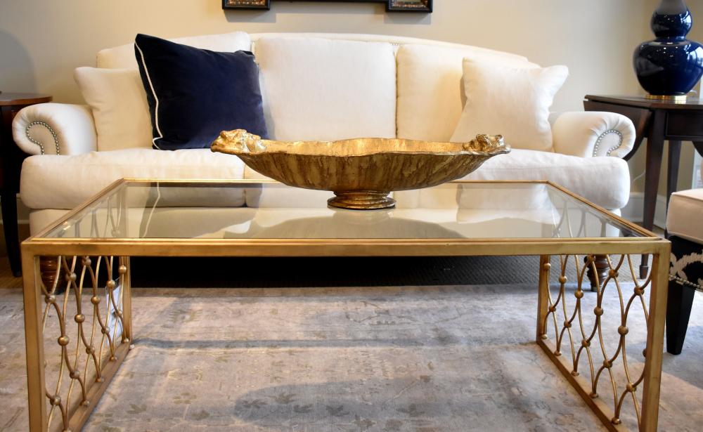 A 28" x 10" Guillot Bowl by Flambeau with an antique gold leaf finish and silver bottom offers a waterfall feel. Ideal for orbs or as a dramatic sculptural piece in contemporary settings.