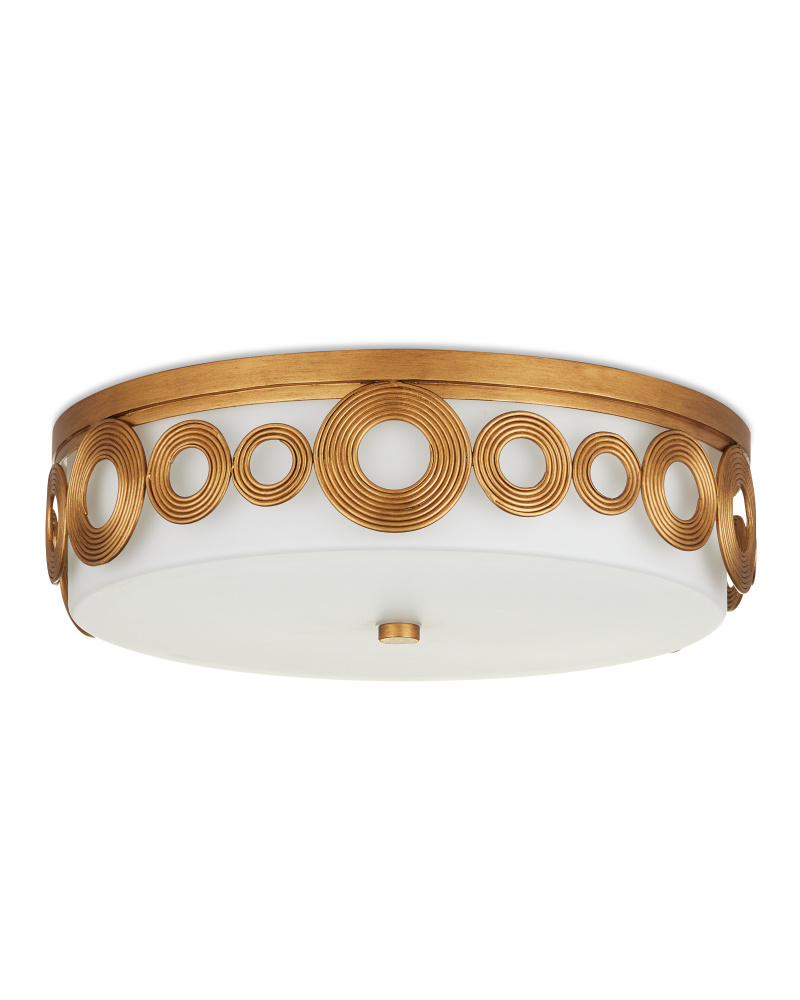 Inspired by a piece of Indian jewelry, the pattern flowing along the outer edge of the Gyges Flush Mount is designed to ornament like a necklace would a person. The decorative elements, frame, and finial are made of brass-finished wrought iron, surrounding the opaque white glass shade with warmth. The dense opacity of the shade creates a beautifully uniform glow when the lights are switched on, making this gold flush mount radiant.