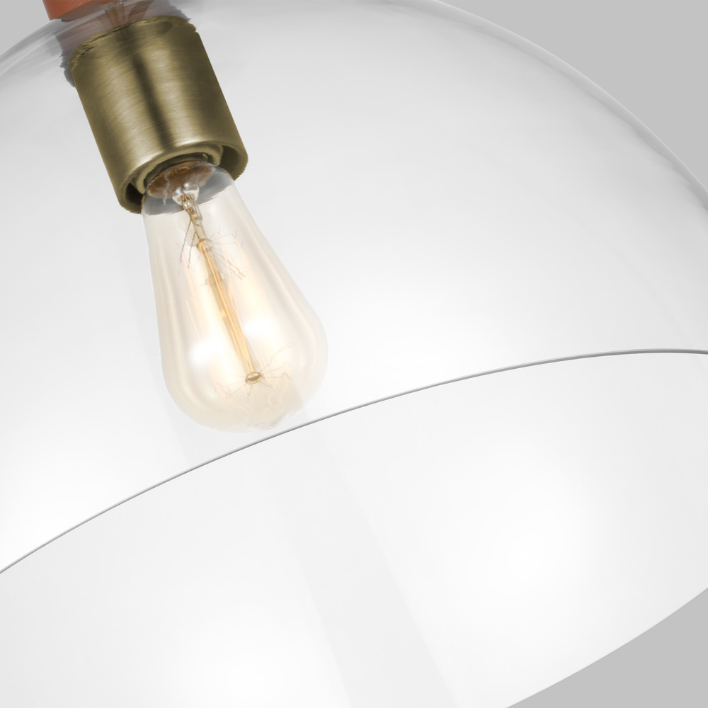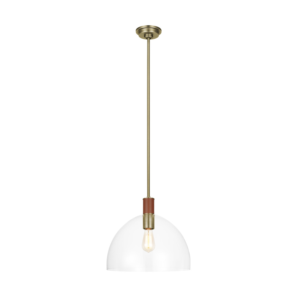 A single bulb is suspended through a clear glass shade and accented with a saddle leather band.