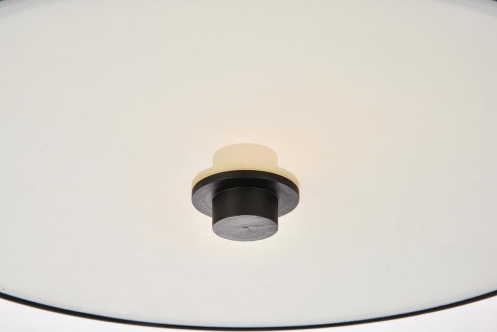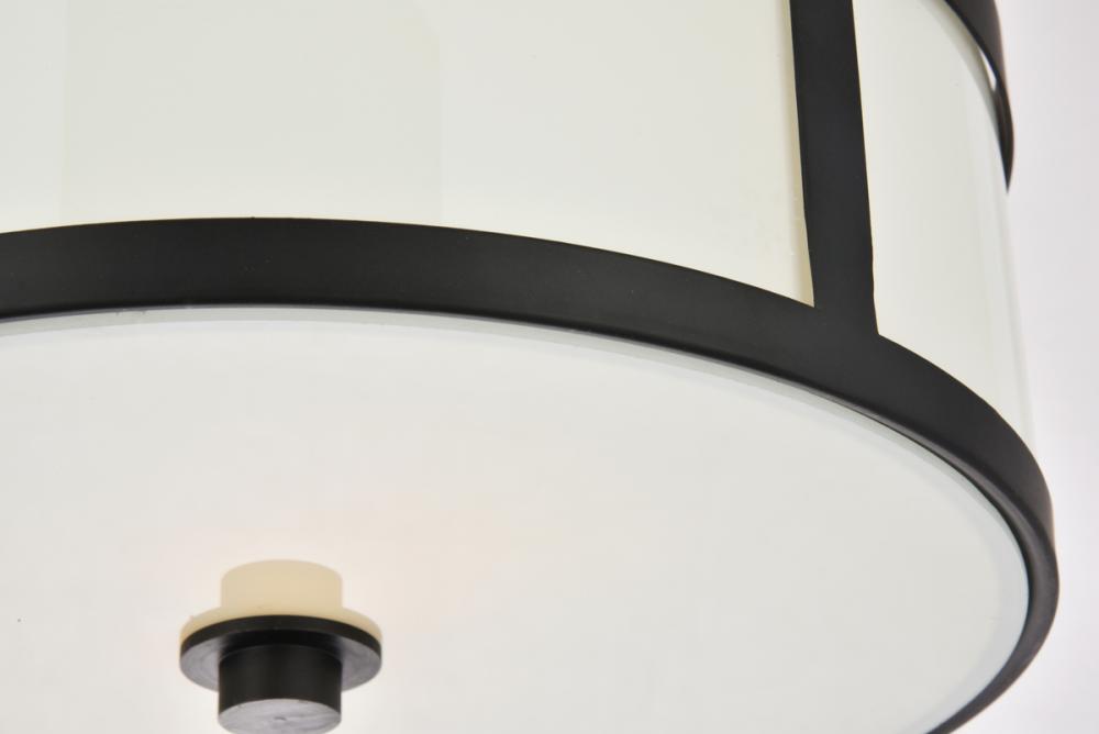 A no-nonsense design that blends seamlessly into a bedroom, kitchen, or office décor, Hadrian collection flush-mount fixtures get the job done while providing a soothing ambiance. A cylindrical steel frame in a flat-black finish gives a pleasant contrast to the curved frosted white glass exterior and circular shade. A matching endcap in the center of the shade and studded accents along the top of the frame add additional personality to the overall look.