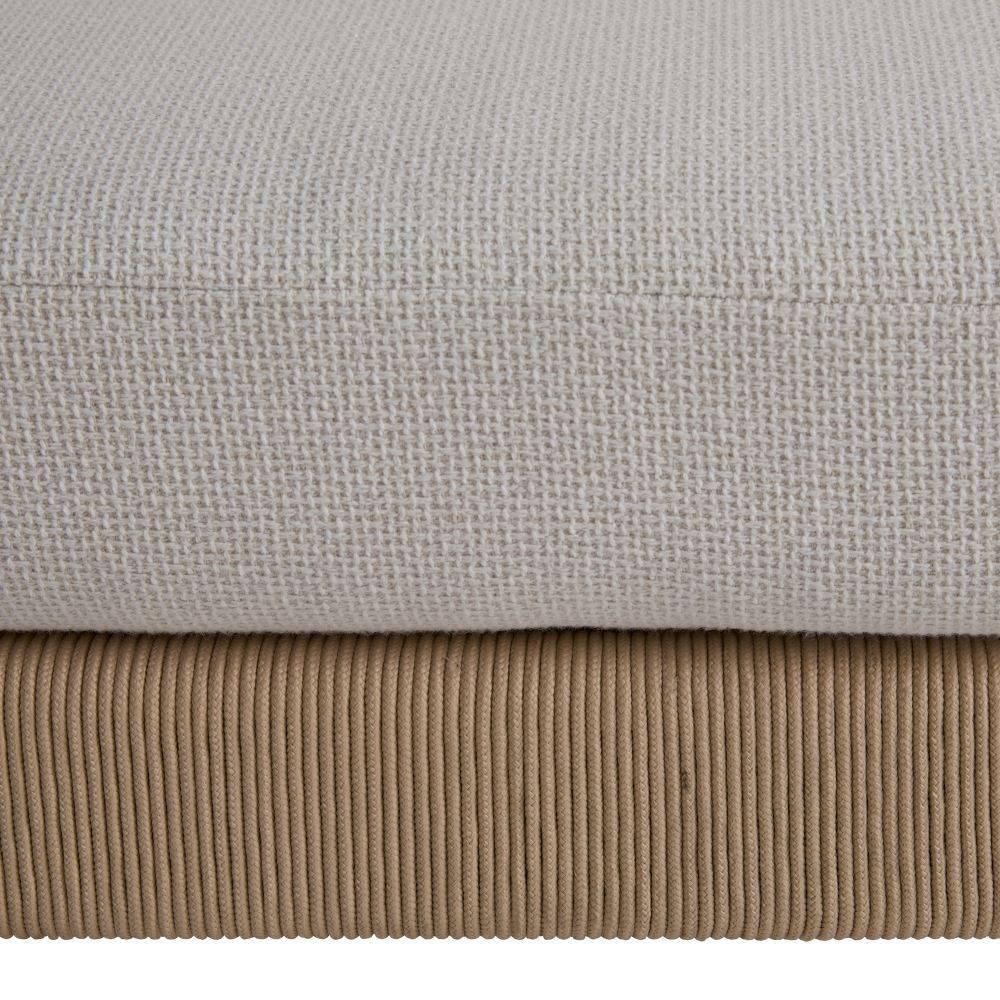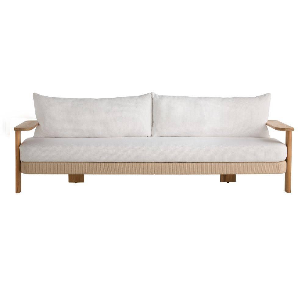 This racerback sofa's minimal lines and joinery details add a dynamic balance to any outdoor setting. Crafted of natural teak wood in a Japanese modern aesthetic, khaki synthetic rope wraps the base. Our Pearl Outdoor Performance Bouclé cushions are hand-stuffed for a relaxed appearance. Wood will vary.